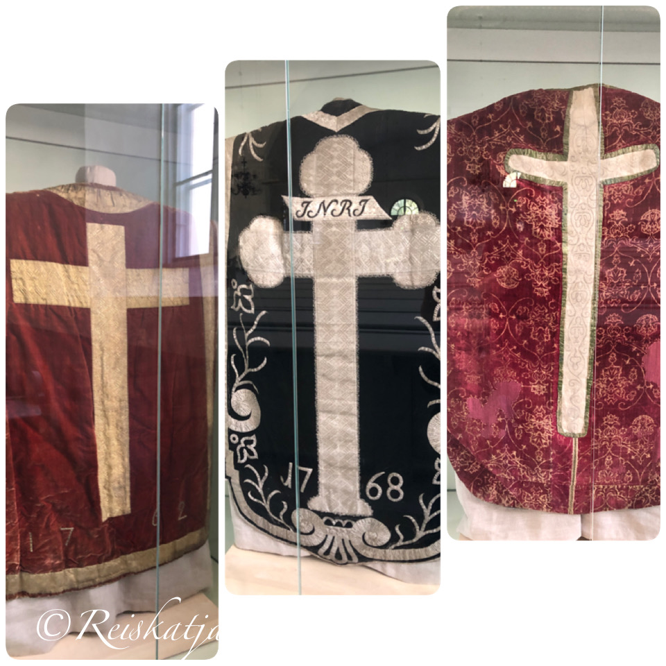 Kirkon yhdellä seinällä on vitriinissä vanhoja messukasukoita. Vanhin vasemmalta on ilmeisesti keskiajalta, keskimmäinen 1768 ja oikealla oleva 1762. Kaunista käsityötä, materiaalina silkkisametti.