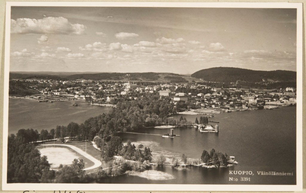 Alla vanha ilmakuva, josta hyvin näkyy Väinölänniemen muotoa ja muutosta tähän päivään nähden. Edessä näkyy urheilustadion ilman katsomoita. Uimaranta ja kylpyläaluetta keskellä.