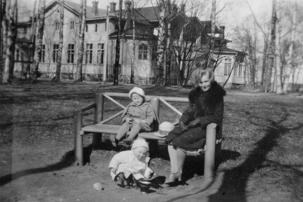 Äiti istumassa lastensa kanssa puupenkillä Väinölänniemellä. Rakennus on Väinölänniemen vuonna 1882 rakennettu teatteritalo, joka tuhoutui tulipalossa vuonna 1967. Kuva. Pielisen museo. Lähde Finna.