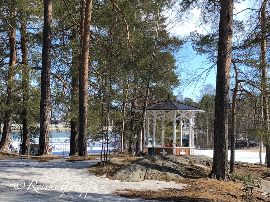 Rönönsalmen kallion huvimaja on rakennettu vuonna 1891. Taustalla näkyy Rönöön menevä silta. Kuvassa näkyy ihmisiä huvimajassa nauttimassa kevätpäivän auringosta.