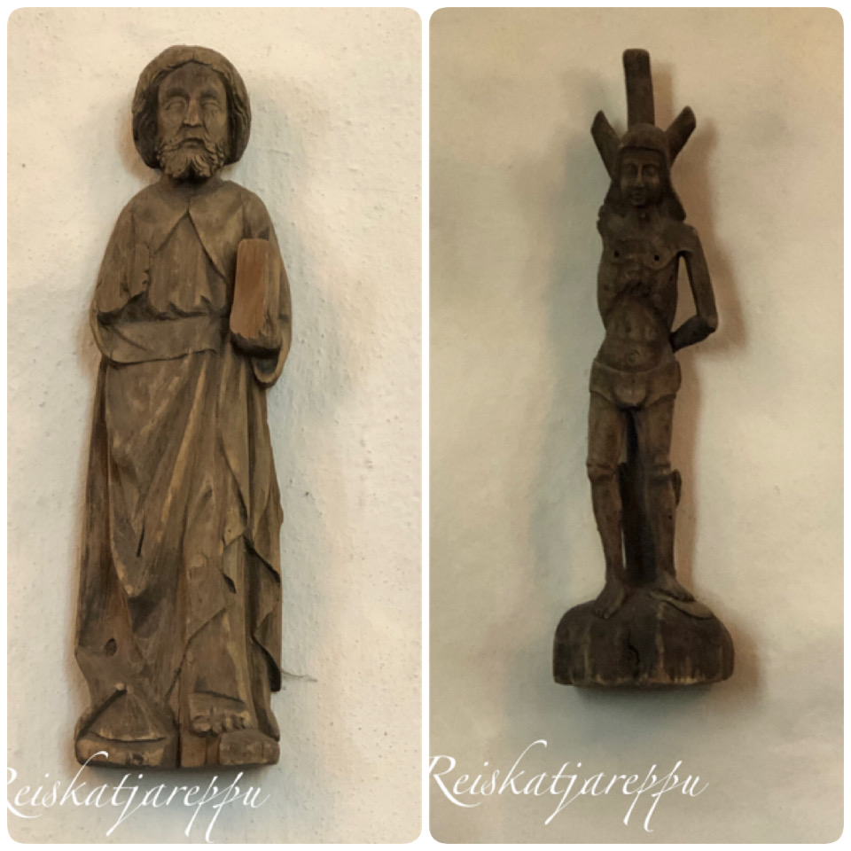 Kirkossa on näkyvillä esineistöstä 1400-luvun alusta oleva kotimainen krusifiksi, sitä hieman nuorempi apostoli, pyhä Sebastian 1500-luvun alusta ja asehuoneen tunnistamaton apostoli.