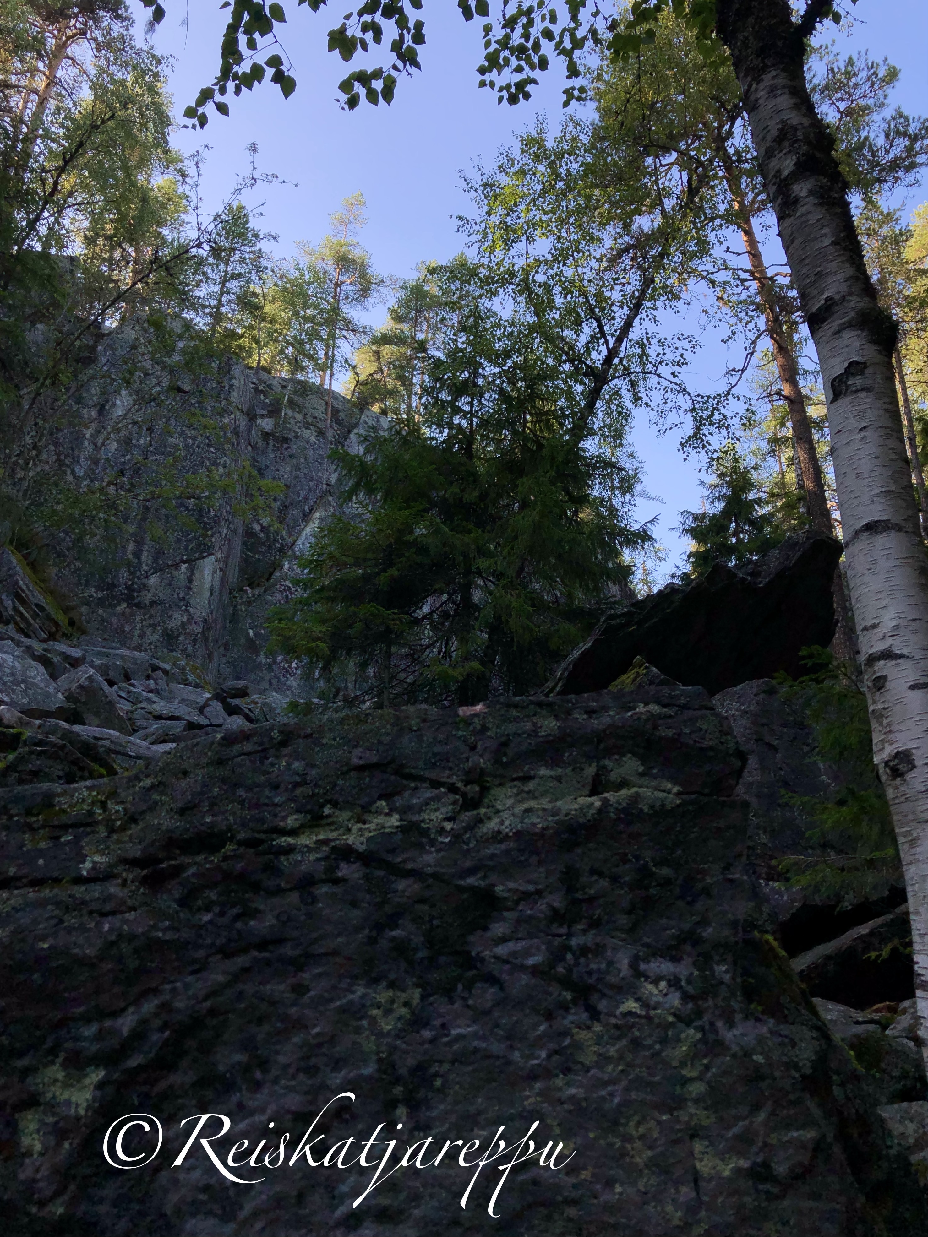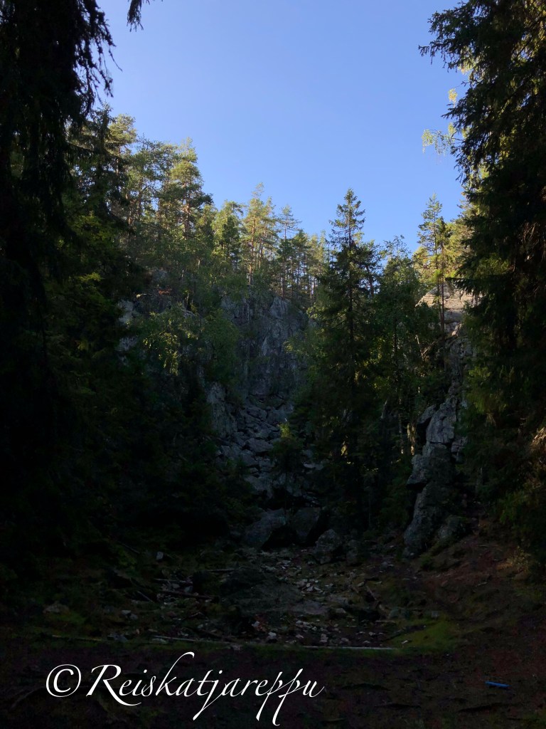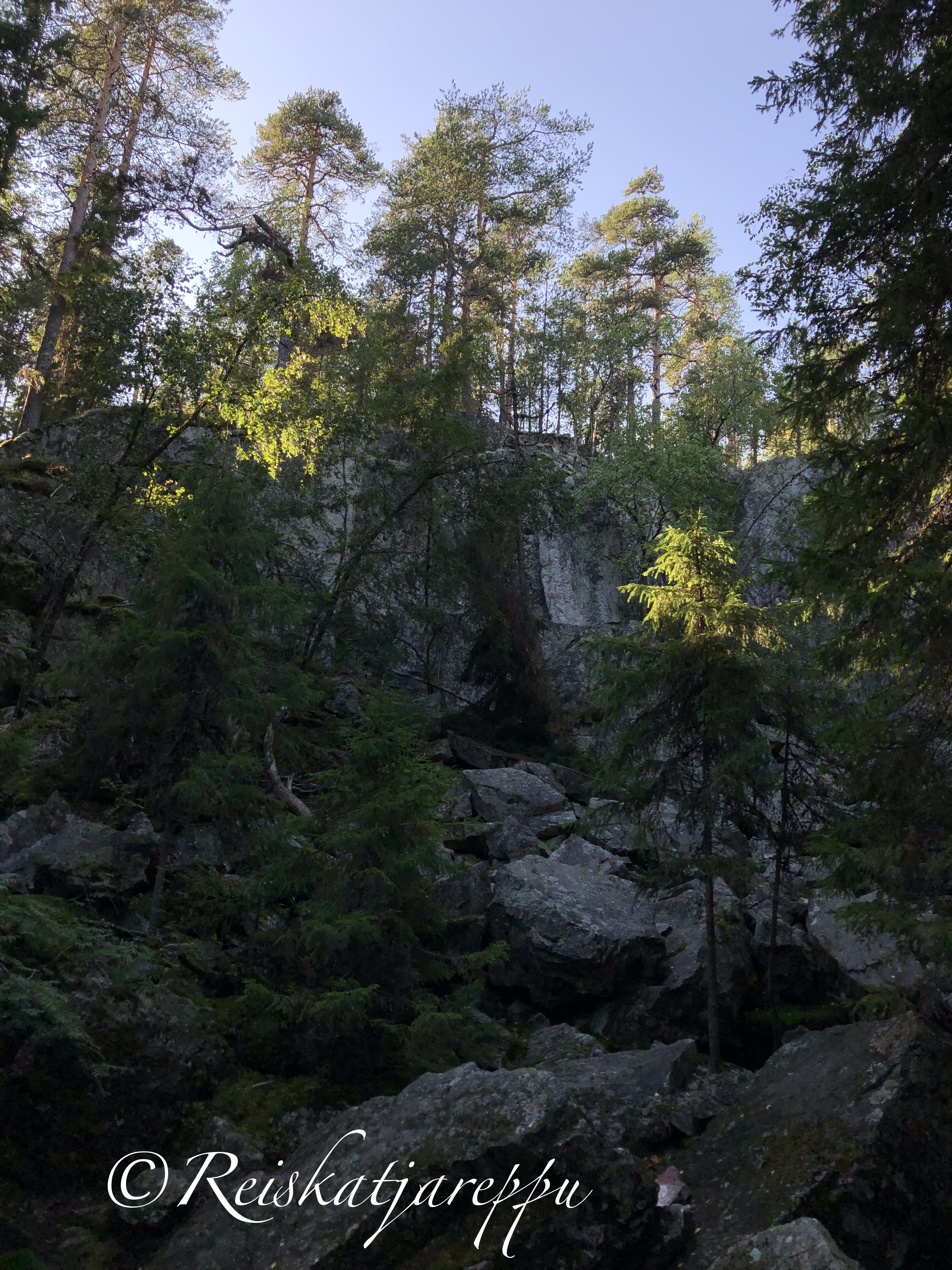 Metsäpolku oli erittäin hyvin merkitty, jossain vaiheessa polulta noustiin kuntoradalle ja kohta viitta osoitti kohti Pirunpesää. Kalliot häämöttivät puiden lomasta, mutta näky oli silti yllättävä, kun se aukeni kokonaan.