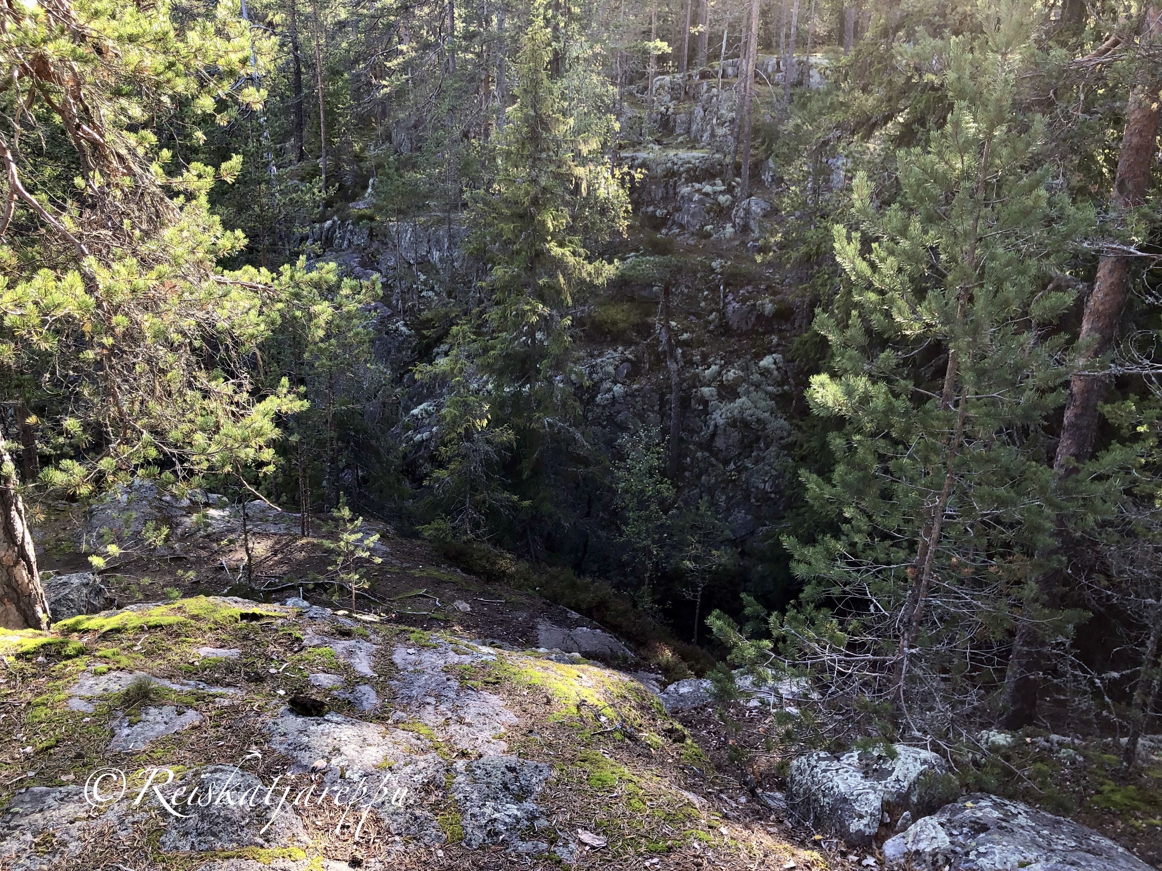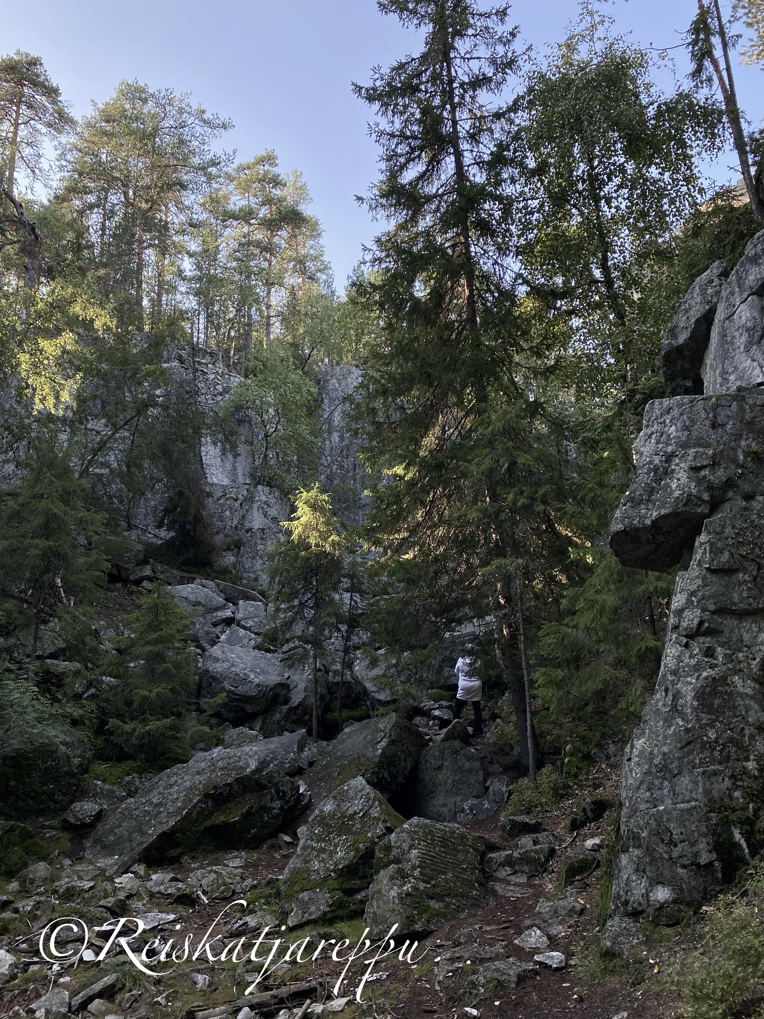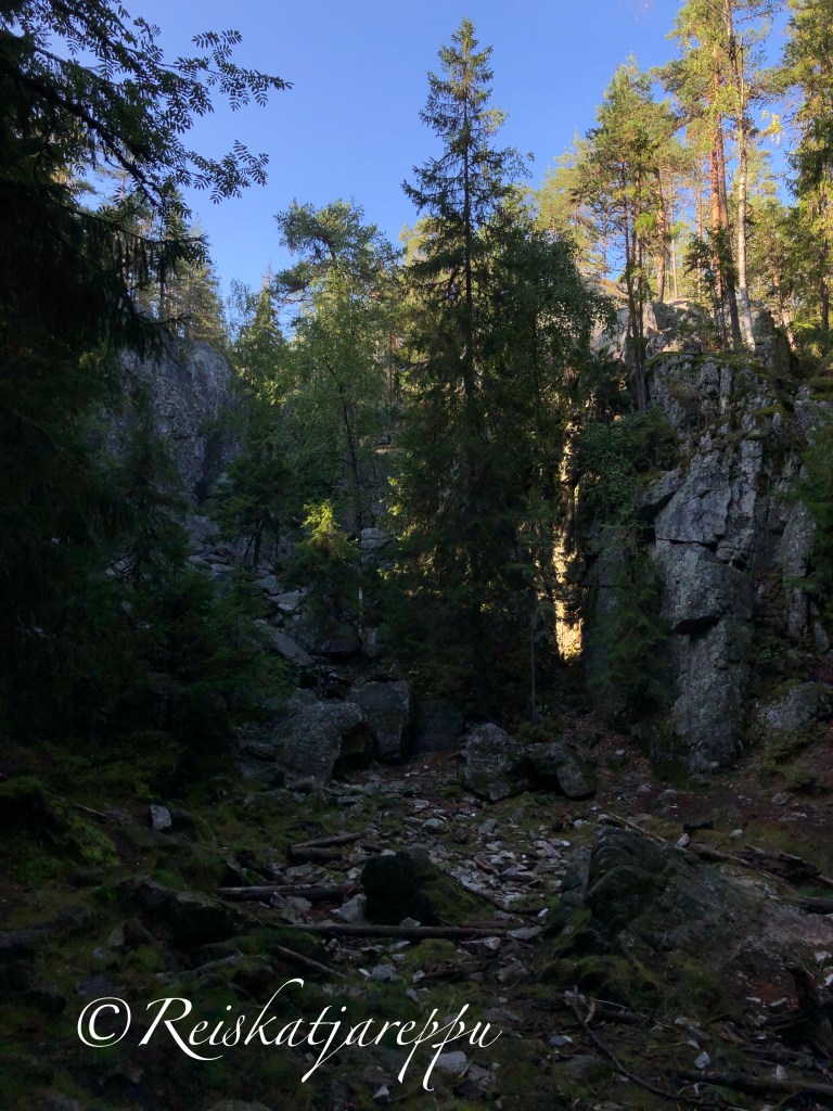 Metsäpolku oli erittäin hyvin merkitty, jossain vaiheessa polulta noustiin kuntoradalle ja kohta viitta osoitti kohti Pirunpesää. Kalliot häämöttivät puiden lomasta, mutta näky oli silti yllättävä, kun se aukeni kokonaan.