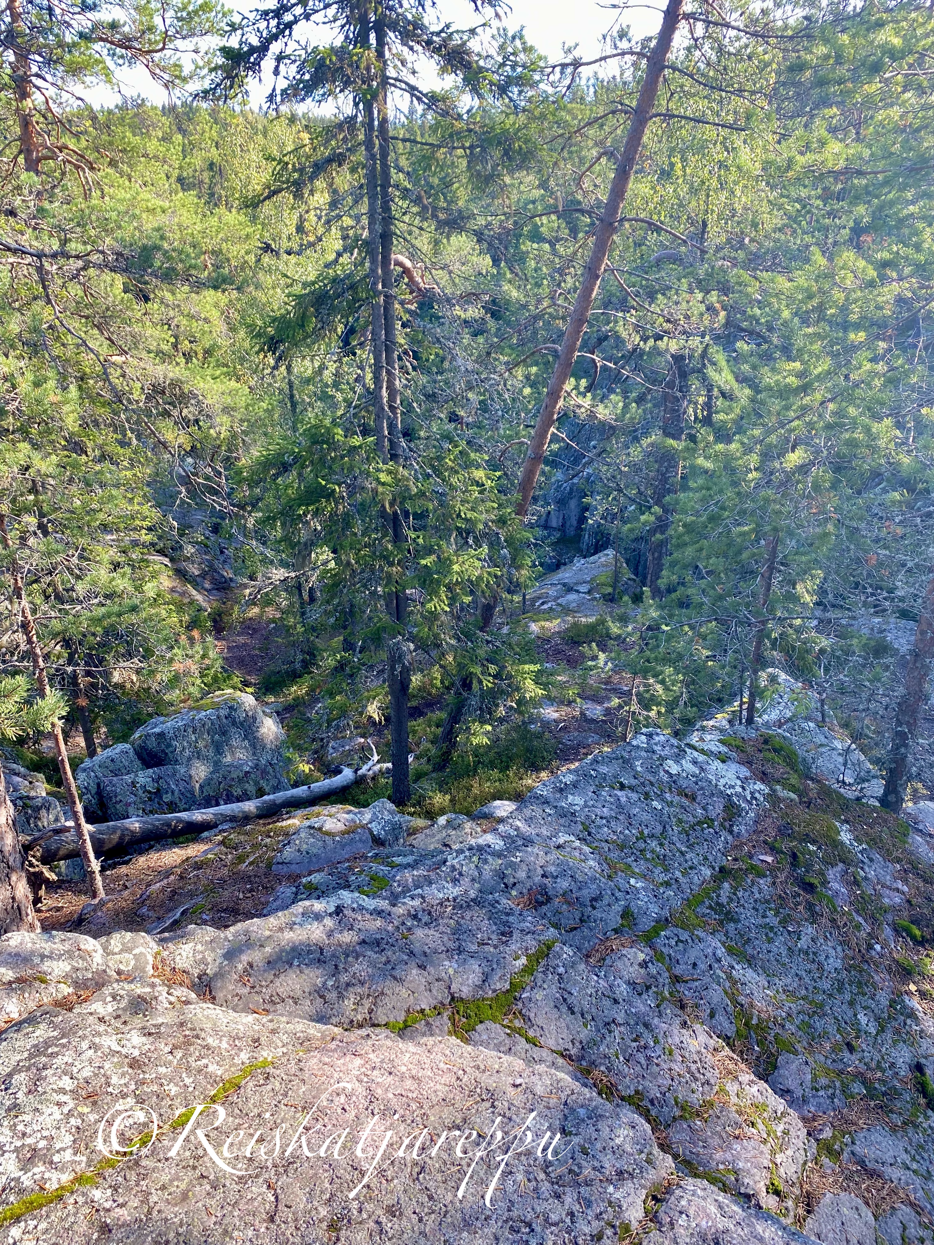 Emme lähteneet sen enempää lohkareikkoon kapuamaan vaan nousimme kallioiden vieressä olevaa polkua pitkin etsimään tietä kohti kallion lakea. Täällä risteili polkuja sinne ja tänne, mutta kuitenkin oli helppo nousta eksymättä syvemmälle metsään.