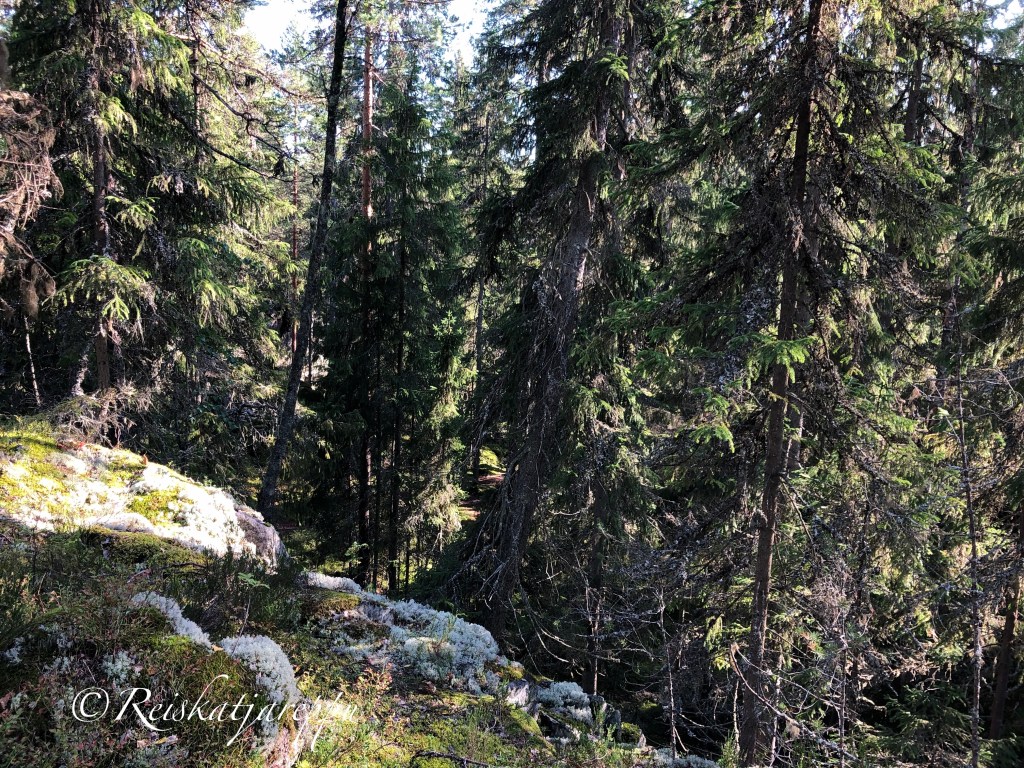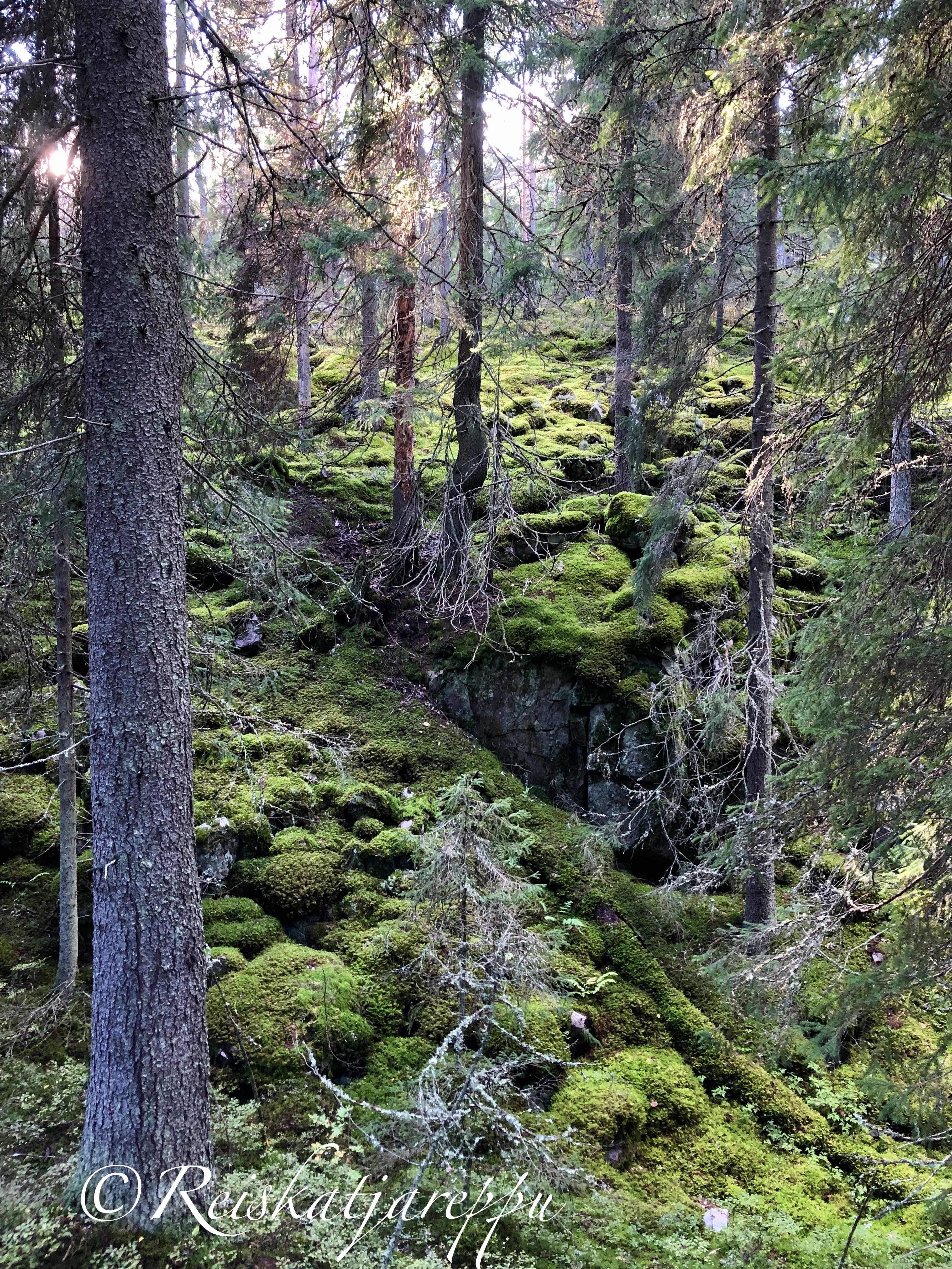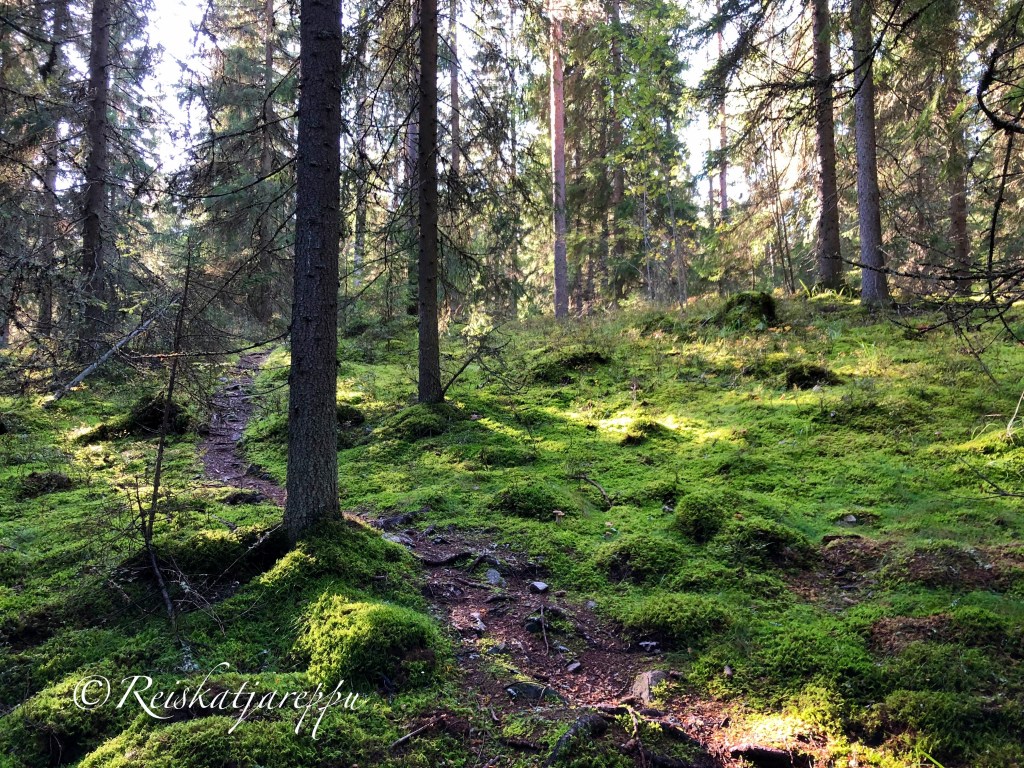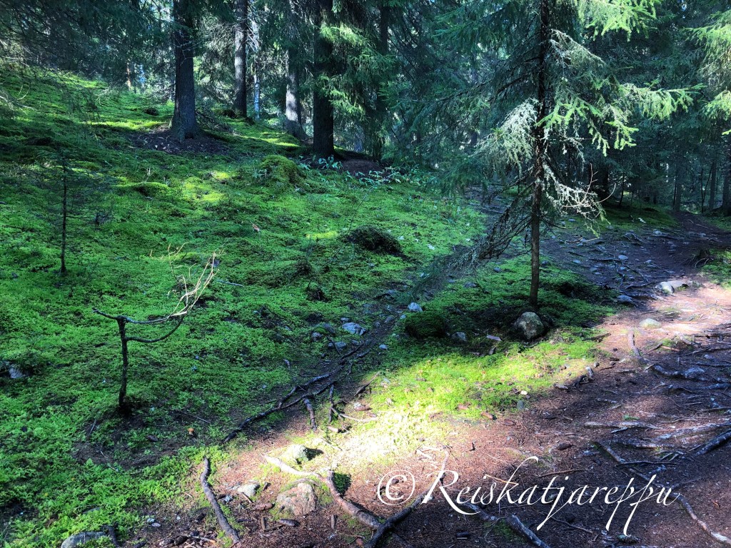 Mikä metsä! Kuin satumaahan olisimme saapuneet, vihreä sammalmatto kaikkialla. Jos ei olisi ollut niin kosteaa, olisimme voineet kellahtaa metsän pohjalle pötköttämään ja katsella puiden latvoja sinistä taivasta vasten. Itikoistakaan ei ollut haittaa. Rauha ja hiljaisuus oli käsin kosketeltavaa. Täällä olisi luullut mörrimöykyn asustelevan, mutta emme sitä nähneet.