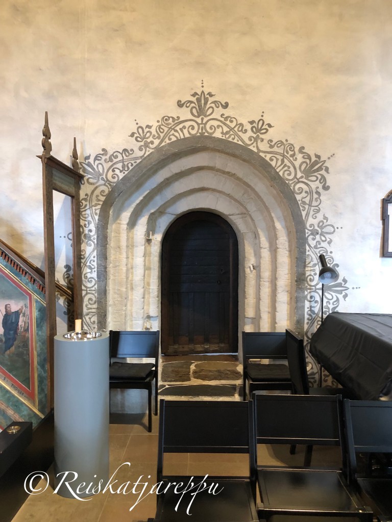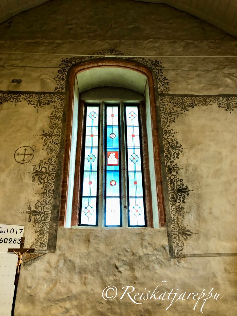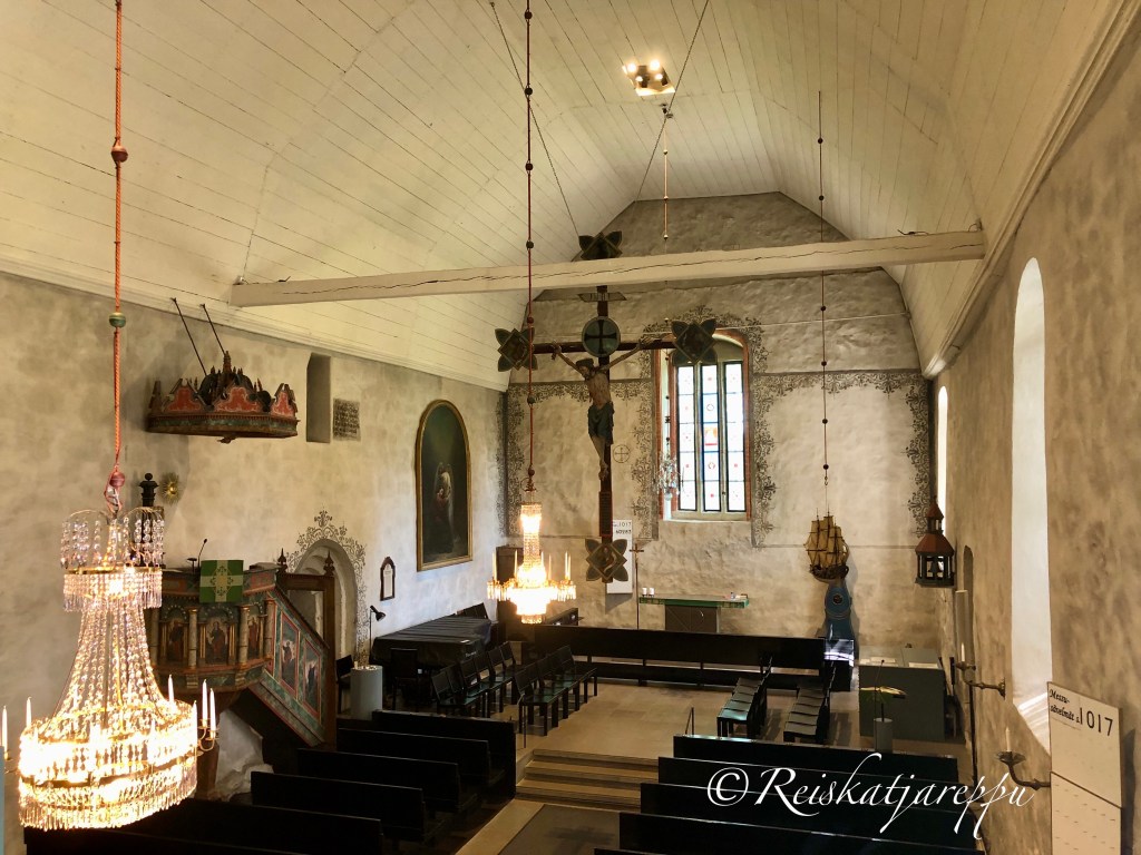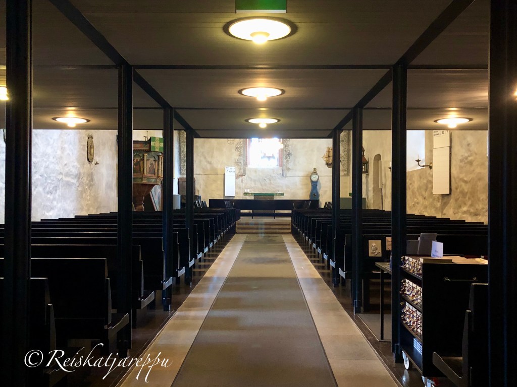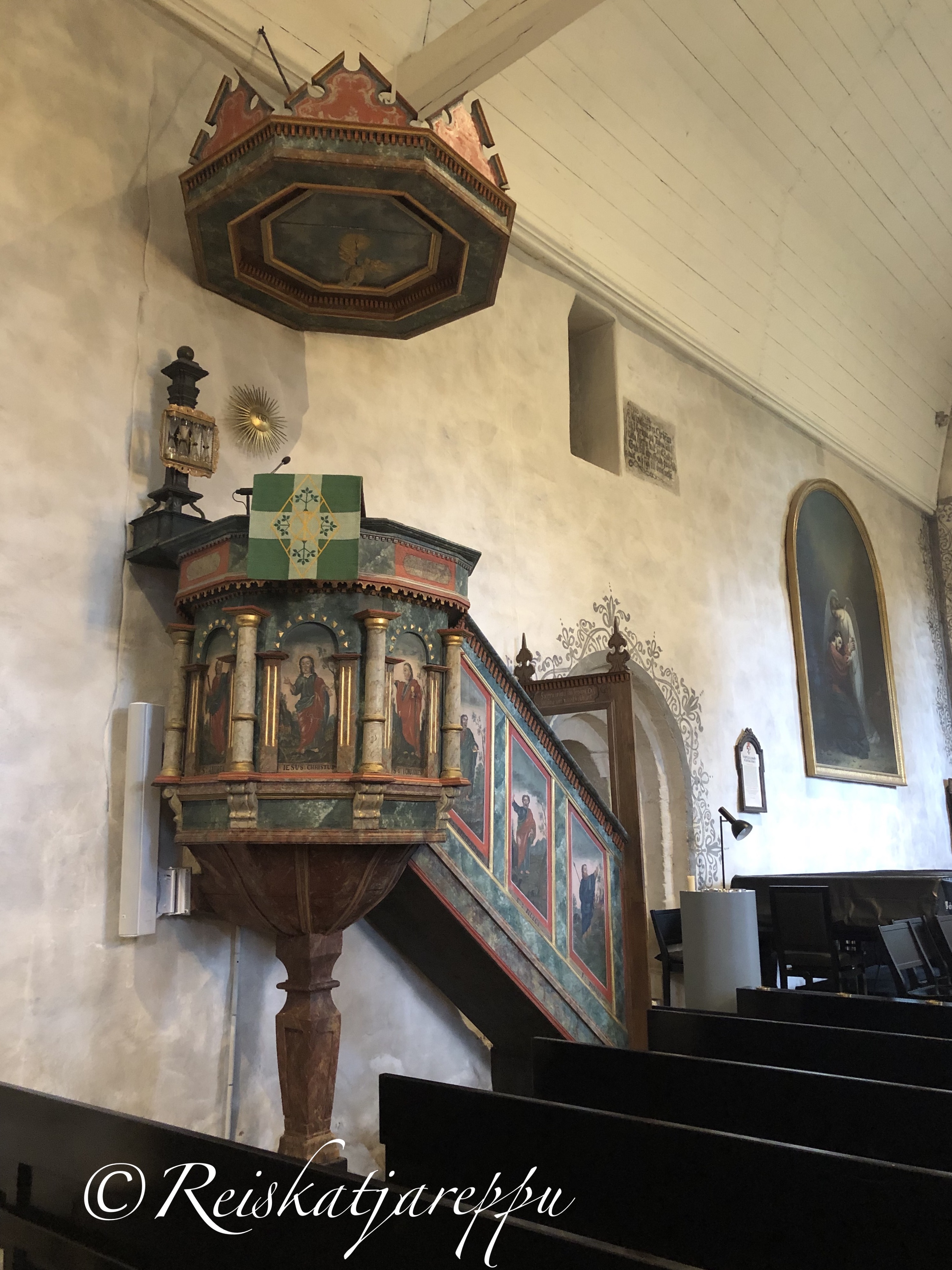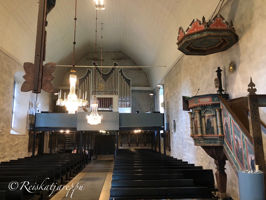 Kirkko on sisältä mukavan ja viihtyisän oloinen. Ainut mikä haittaa bloggarin silmää, on urkulehterin rakenne, joka pistää heti silmään sisään tultaessa. Musta, matala, teräksinen ja tylsännäköinen. Urkulehtereitä on rakennettu moneen kirkkoon jälkeenpäin, mutta taidokkaasti ja hyvin kirkon tyyliin sopivasti. Jostakin aiemmasta puisesta lehteristä maalatut apostolien kuvat ovat urkulehterin portaiden takana seinällä, vähän piilossa katseilta.