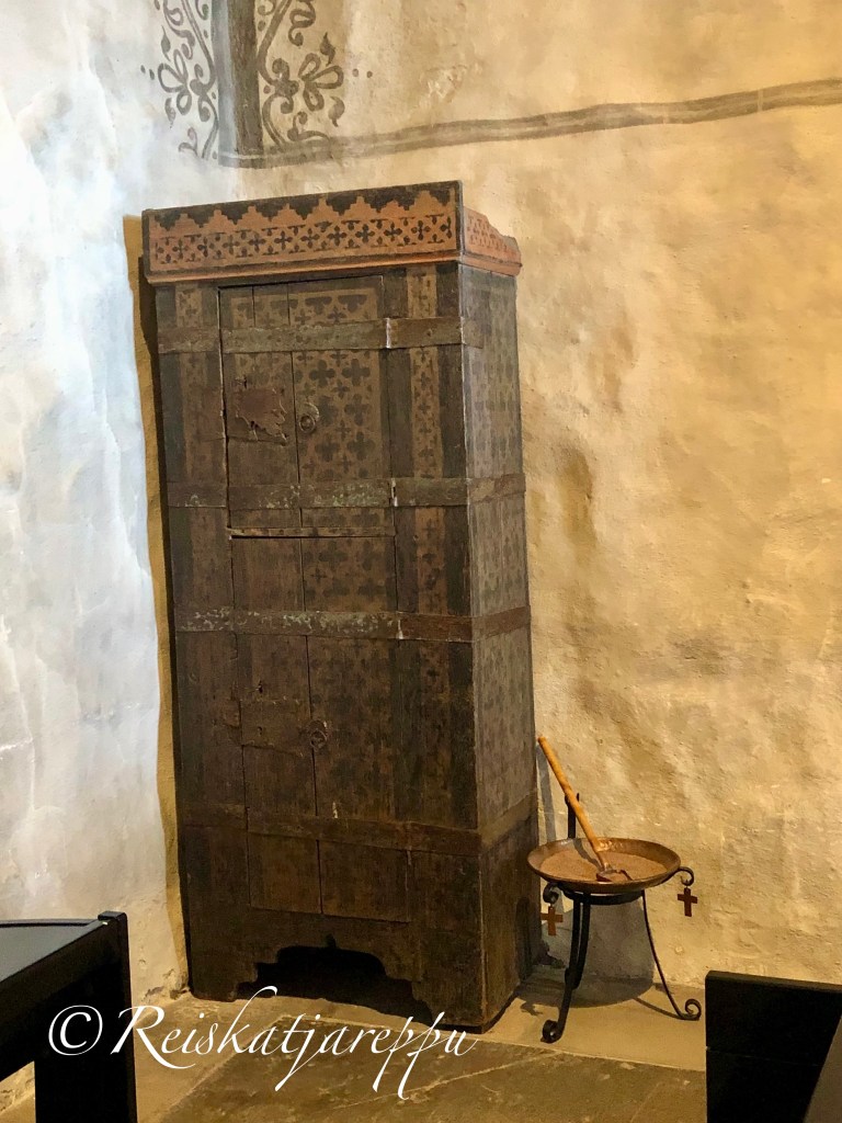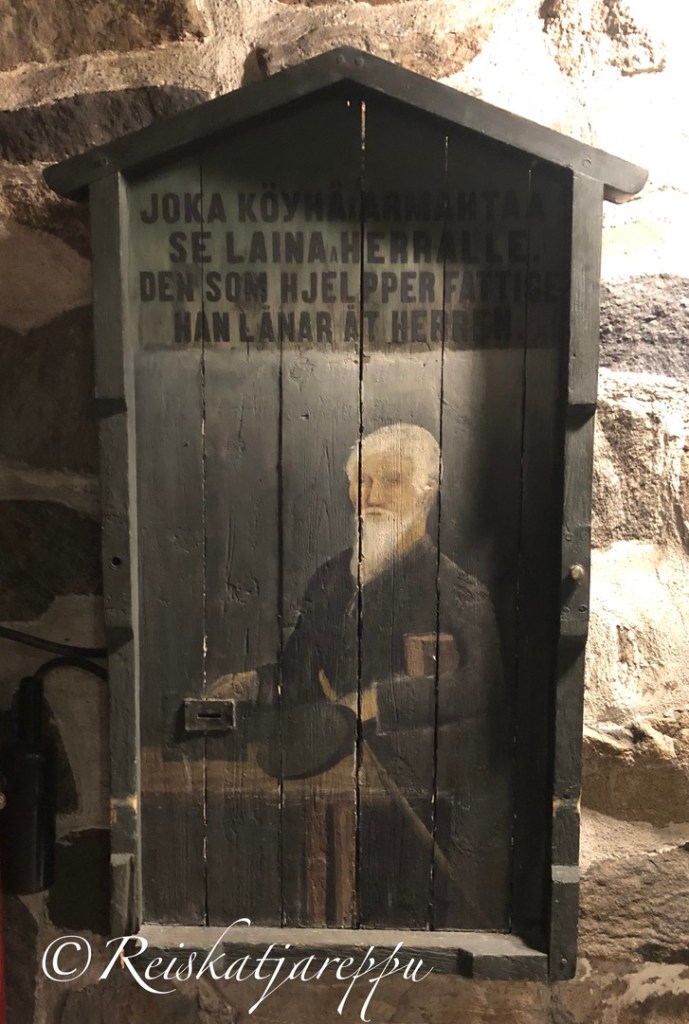 Kirkon eteisessä lähtiessään tai tullessaan on voinut lahjoittaa varoja seurakunnan diakoniatyöhön 1800-luvulta olevaan vaivaisukkotukkiin.