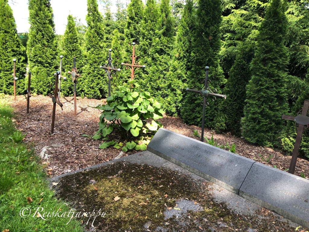 Kirkkotarhan takareunalla on hautamuistomerkkien hautausmaa. Etualalla on vuonna 1968 kirkon restauroinnin yhteydessä siirretyt lattian alla olleet noin 80 tuntemattomattoman raisiolaisen jäänteet tähän leposijaan. Kaunis lause kivessä: Kerran he elivät, tekivät työtä, uskoivat toivoivat.