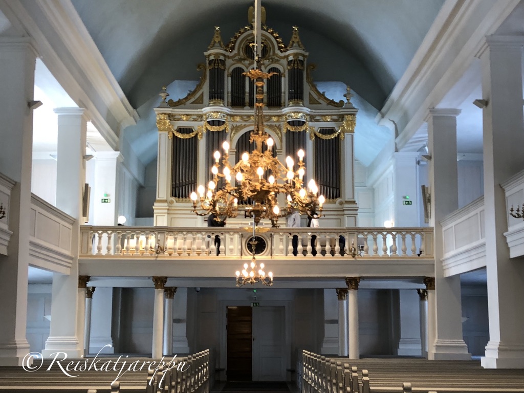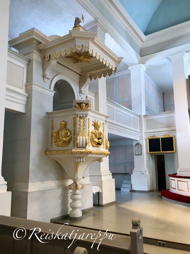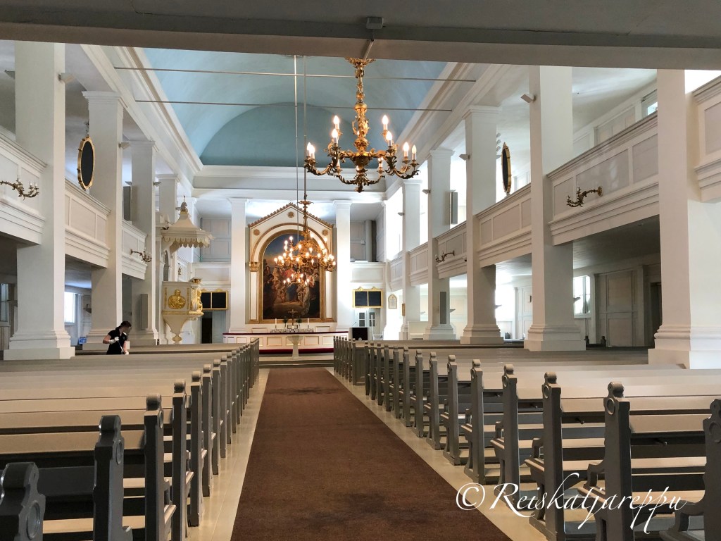 Sisältä kirkko on hyvin pelkistetyn kaunis, korkea holvi luo tilan tuntua ja avaruutta tilaan, jota kutistaa sivulehterit. Sininen katto kuvastaa taivasta. Engelin oma vahva tyyli on tässäkin kirkossa edustettuna, vaaleaa kullalla höystettynä.