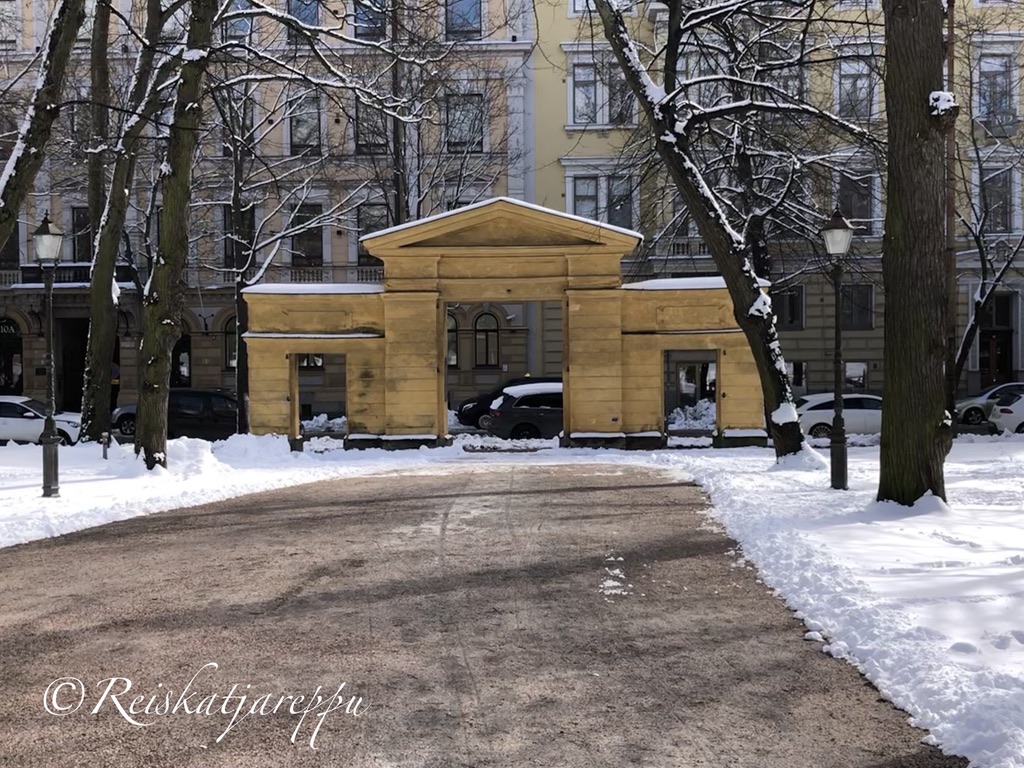 Bulevardilta johtaa komea Engelin suunnittelma portti puistoon, leveä käytävä johtaa suoraan kirkon ovelle, joka kuitenkin on sivuovi. Kirkon pääovi sijaitsee länsipäädyssä.
