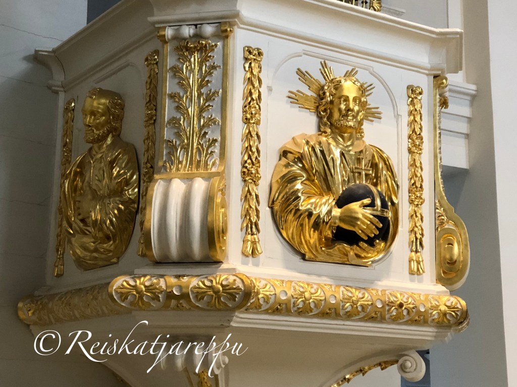 Saarnatuolia koristavat kauniit kullanväriseksi maalatut veistokset.