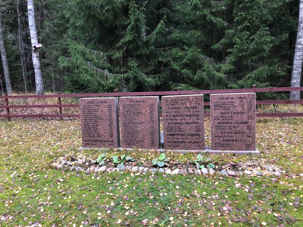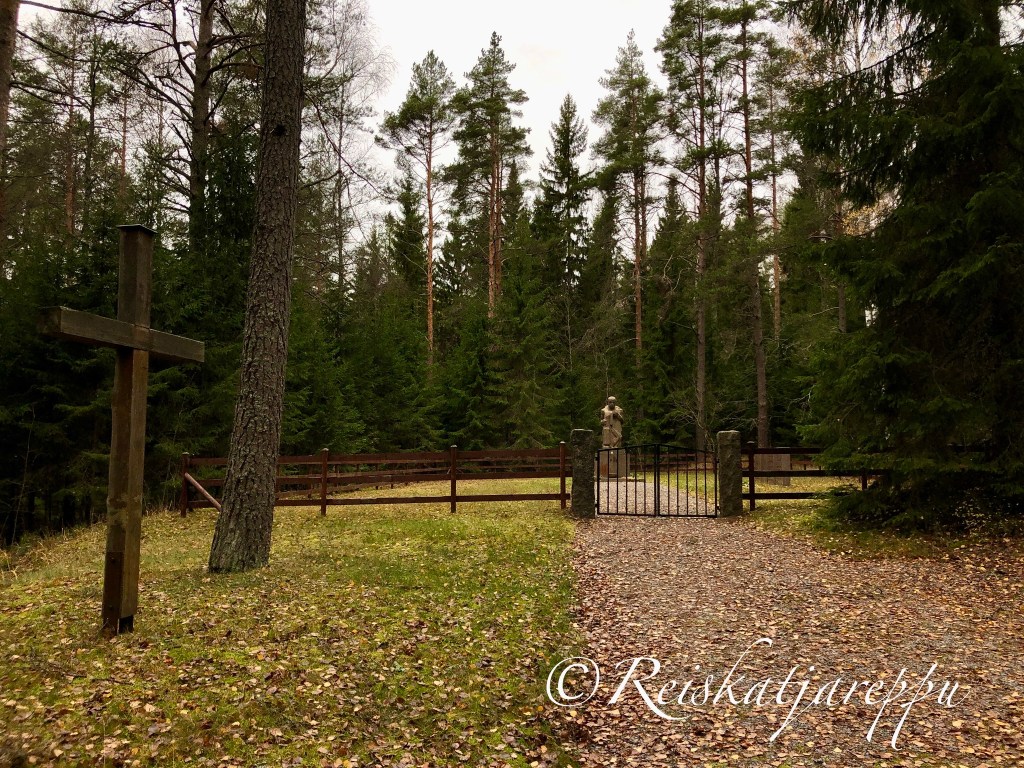 Yllätys oli suuri ja veti hiljaiseksi havaittuamme saavuttuamme pienelle hautausmaalle. Risti, muistomerkki ja aidattu alue keskellä metsää.