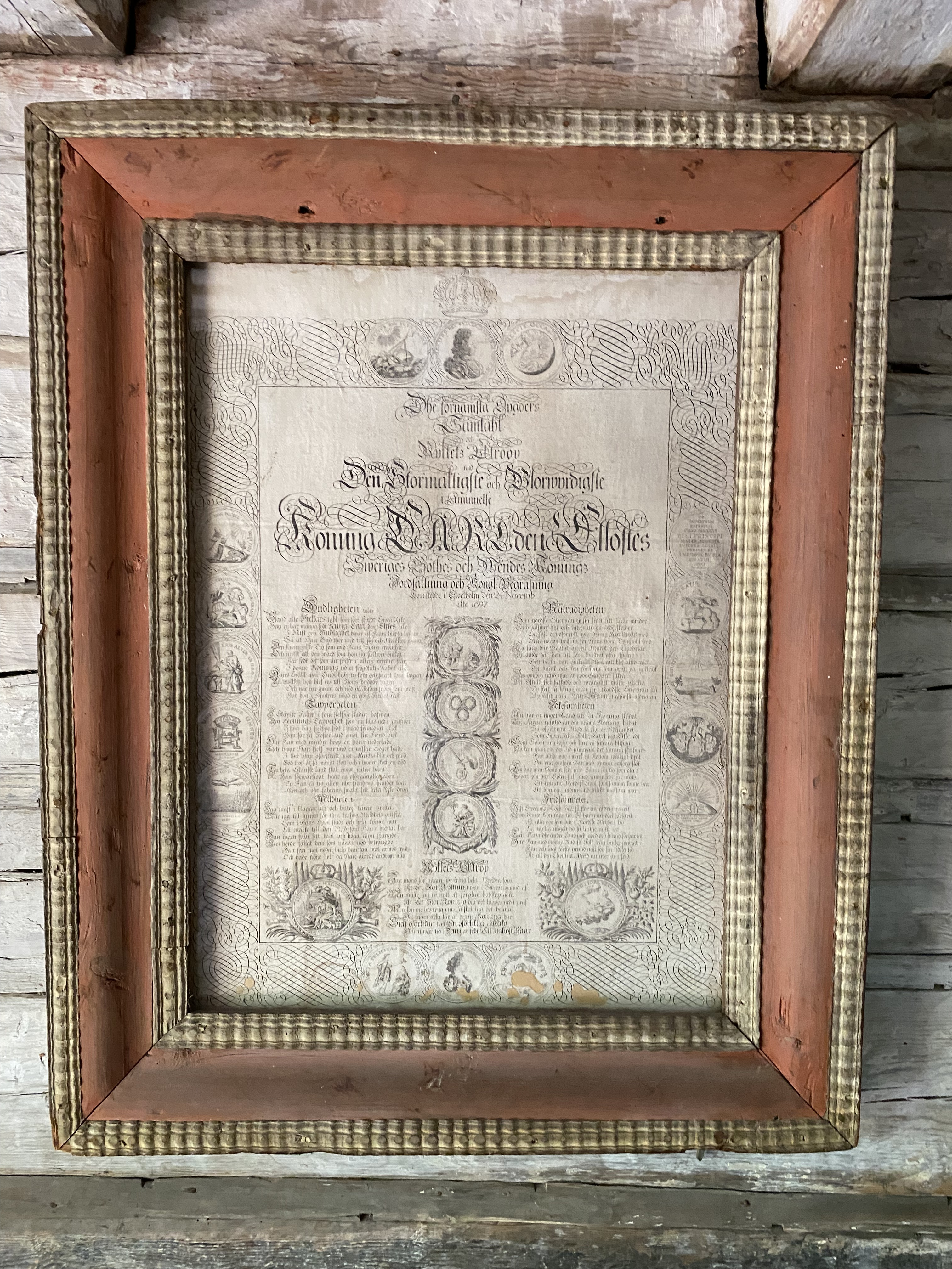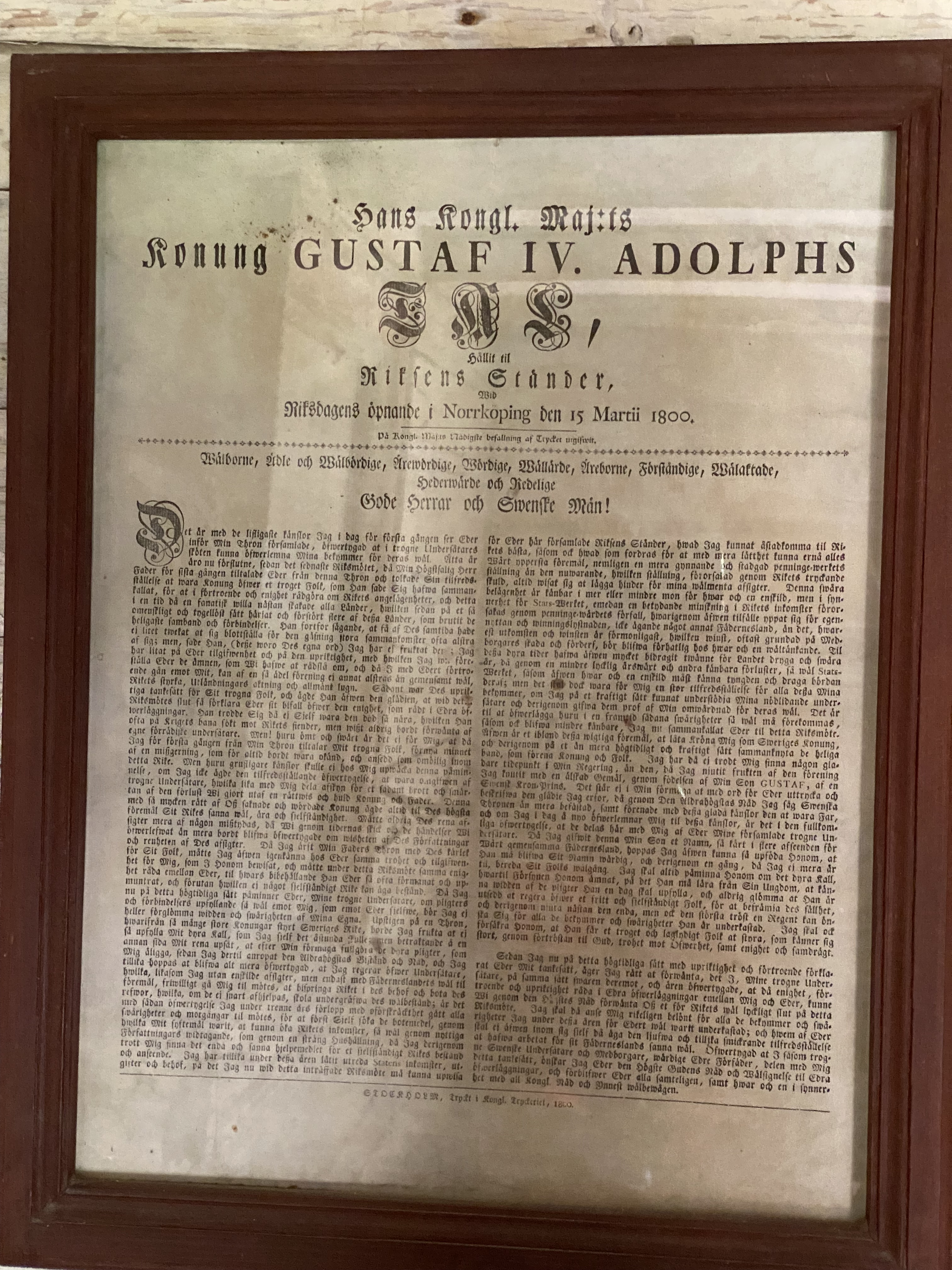 Eteisen seinällä on Kaarle XI urotekoja esittelevä kirjoitus sekä Ruotsin kuninkaan Kustaa IV Aadolfin puhe, jonka hän piti valtaan noustessaan.