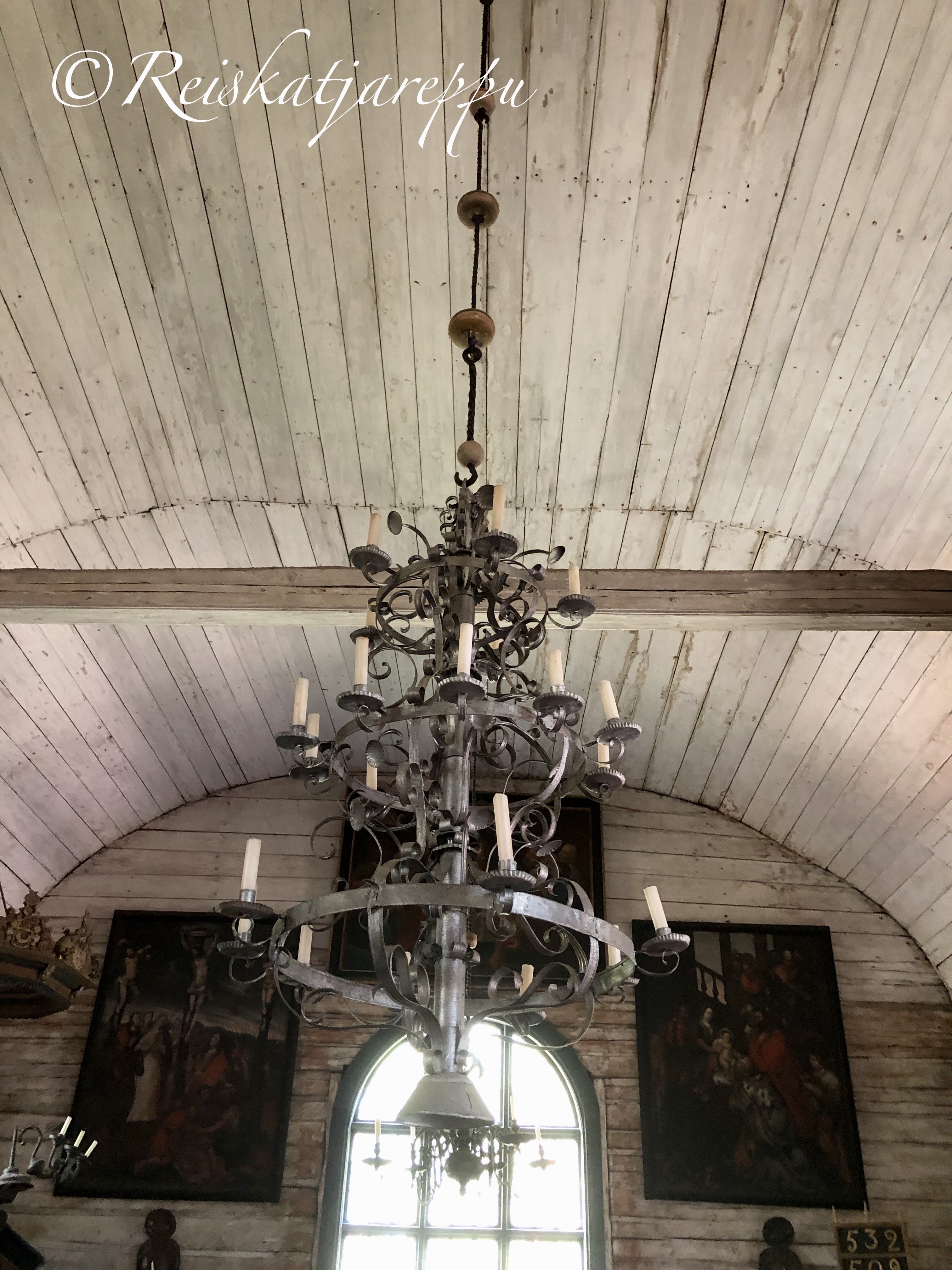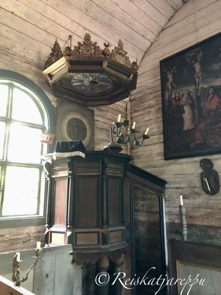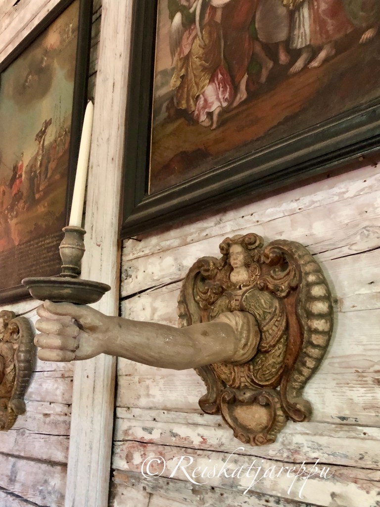 Kirkkoa ei ole sähköistetty, joten päivälläkin se on pimeän oloinen. Tummat taulut seinillä synkentävät kirkon sisätilojen tunnelmaa. Katosta roikku komea, vanha, taottu kynttiläkruunu. Kynttilät toivat valoa kirkkoon ja erilaisia kynttilänpidikkeitä on nähtävillä ympäri kirkkoa.