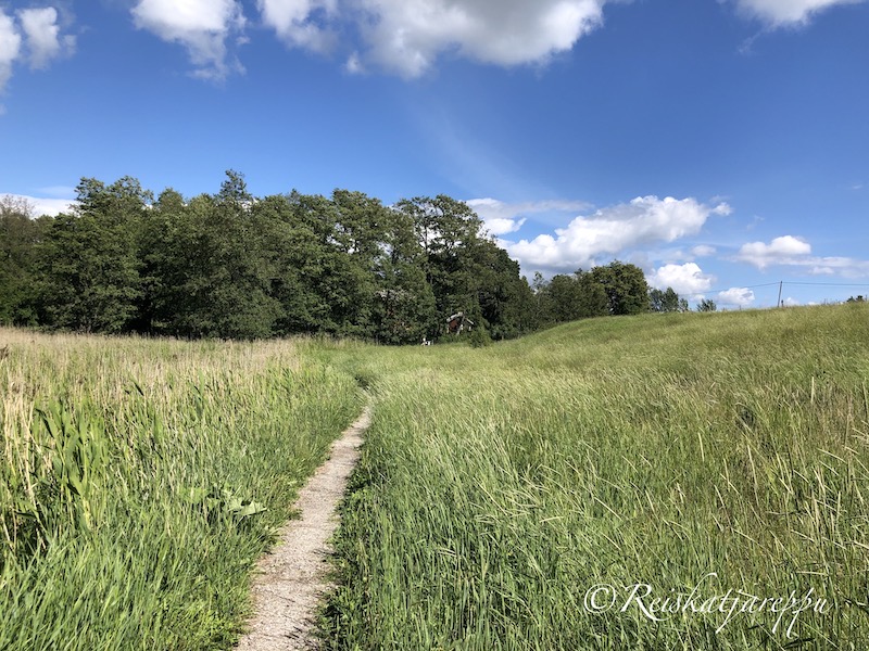 Alkumatkatkasta polku kulki peltomaisemassa ja sitten pujahdimme metsän siimekseen. Polkujen risteys saavutti meidät ja arvuuttelimme kumpaan suuntaan lähdemme, joten kampesimme oikealle. Vasen polku olisi johdattanut näköalapaikalle. Näköalapaikalle on jyrkkä nousu ja siellä taukopaikka. Välillä mennään ottamatta asioista etukäteen selkoa ja näin saattaa käydä, että paikkoja jää näkemättä.