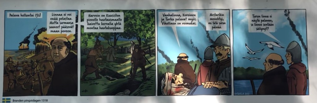 Kävimme kiertämässä Kuusiston piispanlinnarauniot. Kahvilasta ostimme jäätelöt, jotka söimme saunan ikkunan alla olevalla penkillä. Saunarakennus toimii kesäisin Kaarinan seurakunnan hiljentymispaikkana. Hiljennyimme ulkopuolella, katselimme ympäröivää kesäistä luontoa, ja nautimme jäätelön viileästä mausta lintujen konsertoidessa ympärillämme. Saunan nurkalta jatkoimme matkaa luontopolulle.