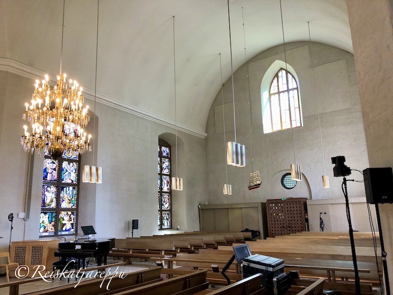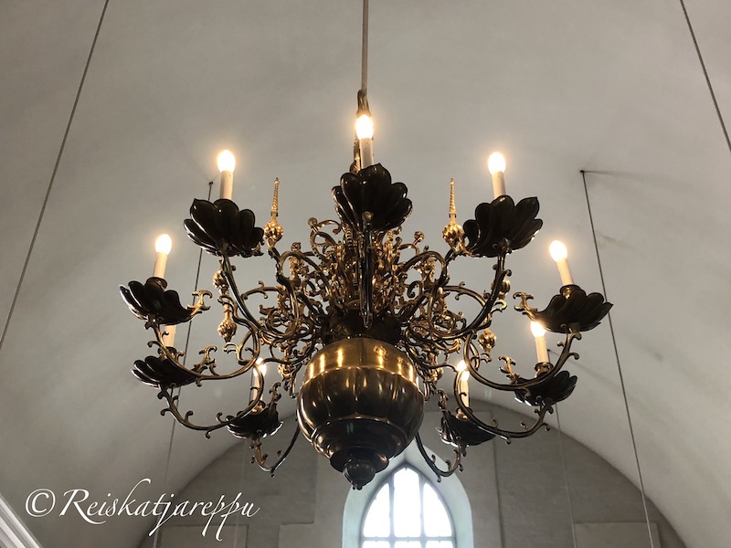 Kirkkoa valaisee upeat kattokruunut. Vasemmalla Jöns Perssonin vuoden 1658 lahjoitus nykyisillä ledvalokynttilöillä varustettuna ja oikella pienempi Erik Buren ja Birita Eriksdotter Palntingen lahjoittama 1671 kattokruunu.