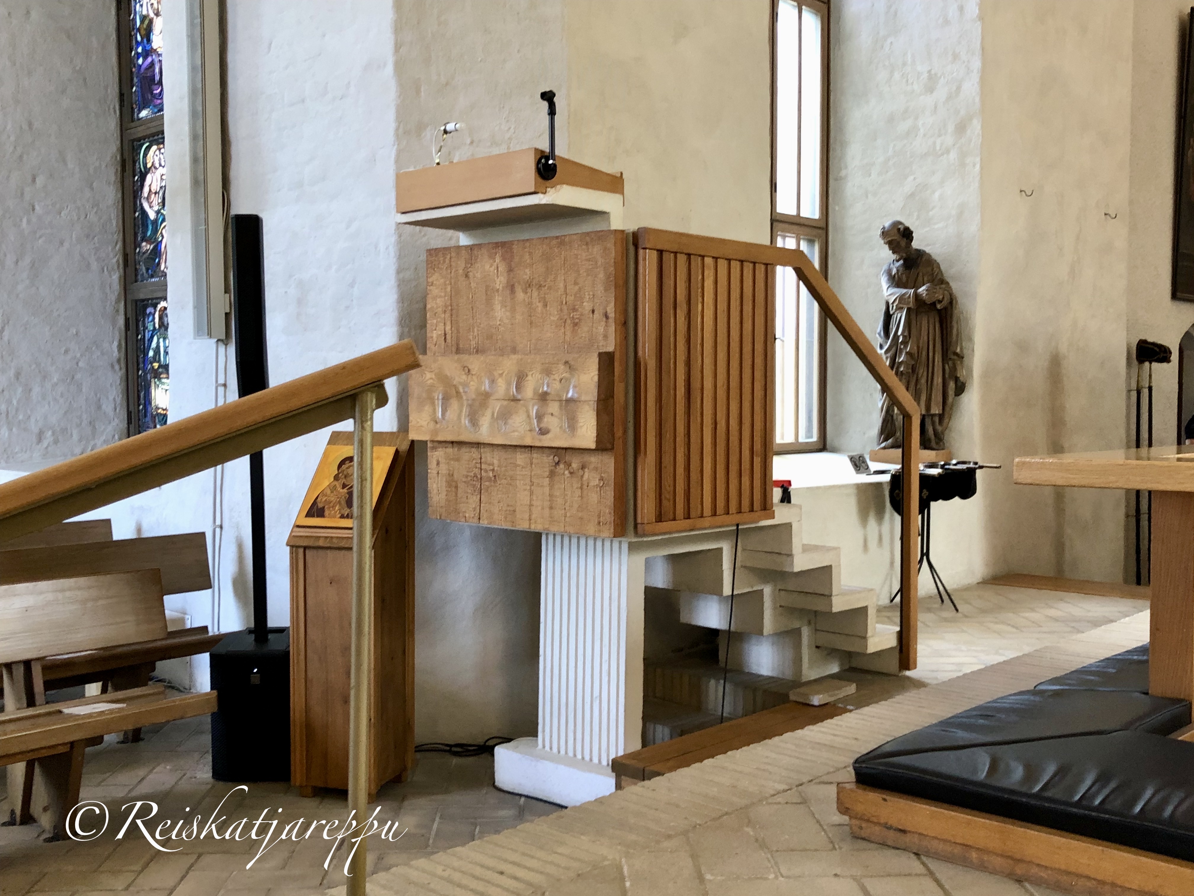 Saarnatuolin vieressä on kirkon lukupulpetti, jota koristaa Madonnan kuva.