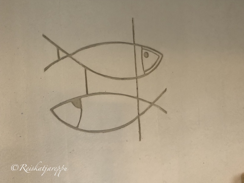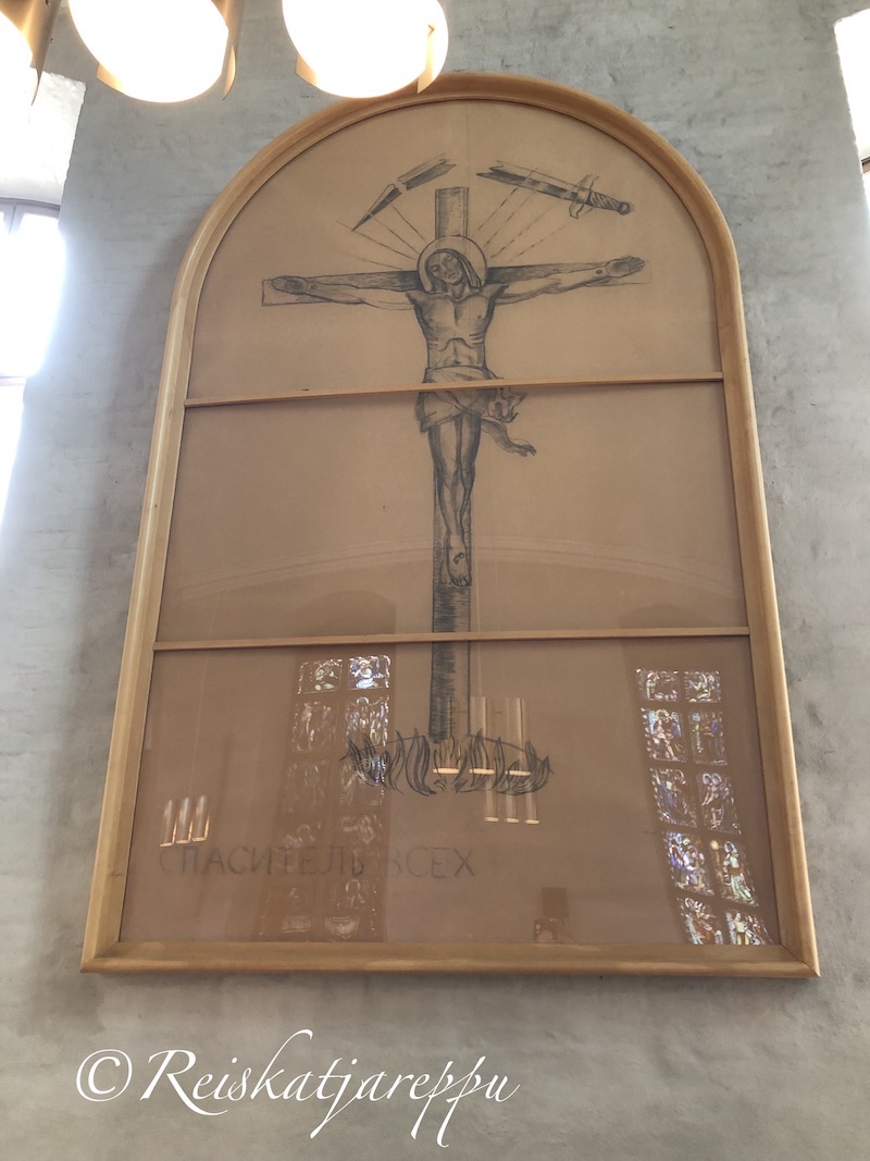 Porkkalan vuokra-aikaan ja kirkon tyhjentämiseen liittyy tarina. Taiteilija Lennart Segerstrålen oli evakuoimassa kirkon taideirtaimistoa vuonna 1944. Venäläisille hän jätti pahville piirtämänsä hiilipiirroksen (alla vasemmalla), johon kirjoitti venäjäksi Jeesus kaikkien kansojen Vapahtaja. Venäläisiltä työ ei jäänyt huomaamatta, ja se määrättiin hävitettäväksi. Suomalainen upseeri piilotti piirroksen kotiinsa, ja vuonna 1980 se palautettiin kunnostettuna kirkon pohjoissakaran seinälle. (Wikipedia)