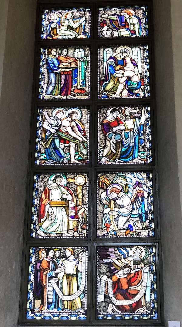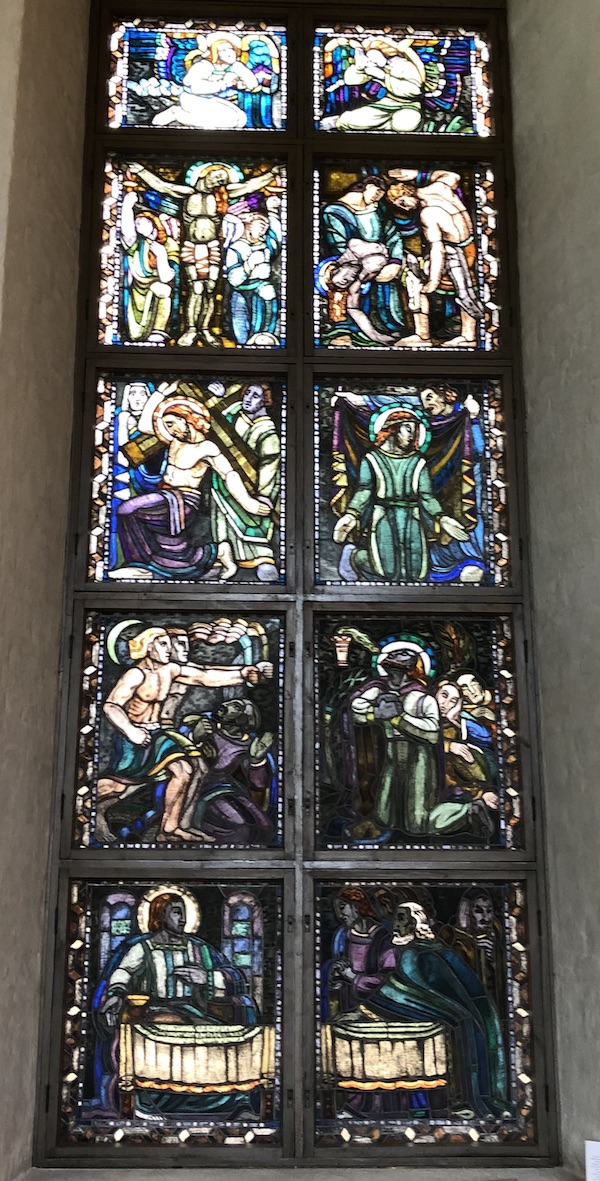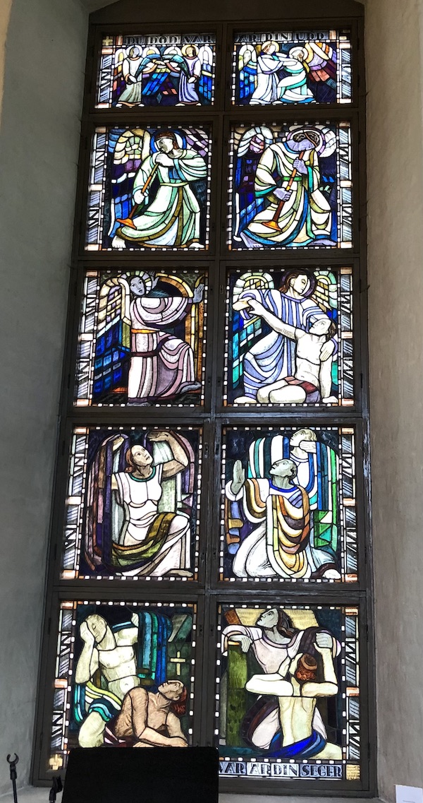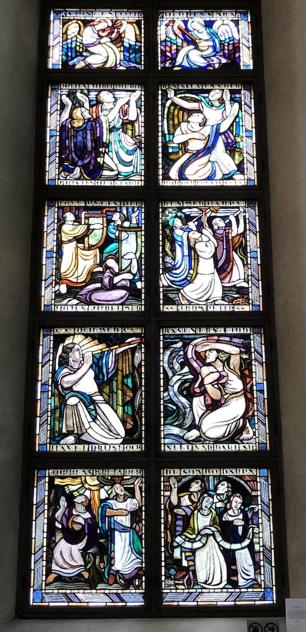 Ikkunoiden kauniit ja värikkäät lasimaalaukset ovat taiteilija Lennart Segertrålen maalaamat vuosina 1930-1931. Niitä on neljässä ikkunassa, eli kymmenen maalausta per ikkuna. Ne ovat nimetyt: Vertauksen ikkuna, Kärsimysten ikkuna, Ylösnousemuksen ikkuna ja Ylistyksen ikkuna.