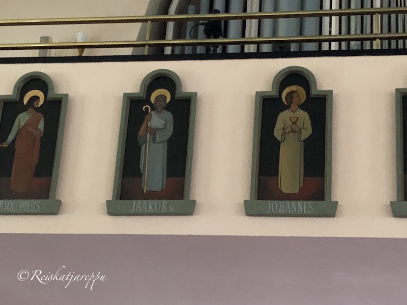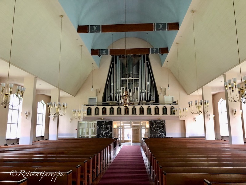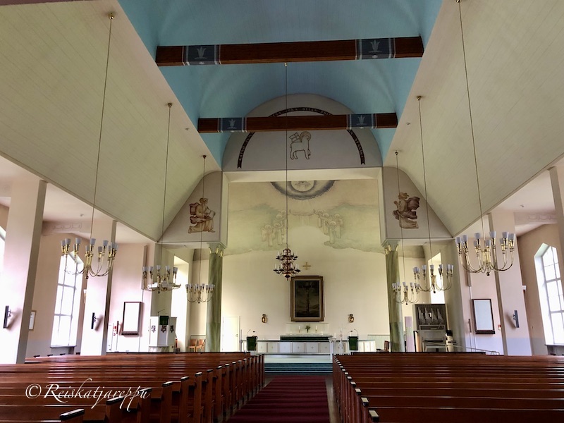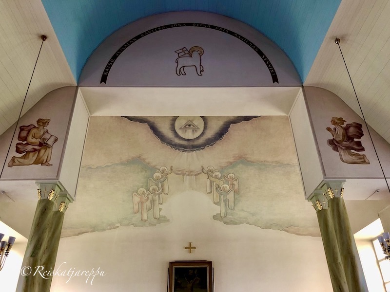 Urkuparvea koristavat apostolien kuvat, jotka ovat taiteilija Antti Salmenlinnan vanhaan kirkkoon tekemät. Hän oli maalannut vanhan kirkon kattomaalaukset viimeisimmän remontin jälkeen. Hänet kutsuttiin maalaamaan mahdollisimman samanlaiset kattomaalaukset uuteen kirkkoon. Ehdottomasti kolmiyhteisen Jumalan valvova silmä täytyi tulla tähän maalaukseen. Kirkkosalissa on korkea sininen sisäkatto, jolloin seurakuntalaiset voivat kokea olevansa lähellä taivasta.