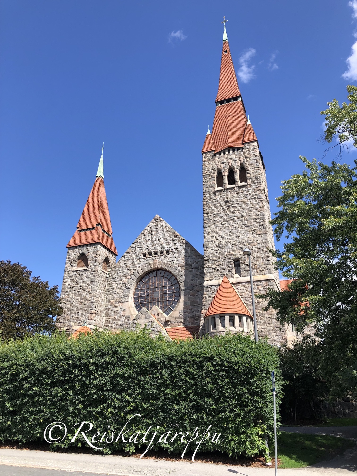 Komean, kivisen, massiivisen kirkon tornit kohoavat Tampereen Juhannuskylässä kohti sinistä taivasta. Kyseessä on arkkitehti Lars Sonckin suunnittelema ja vuosina 1902-1907 luonnonkivestä rakennettu kansallisromantiikkaa edustava pyhättö.