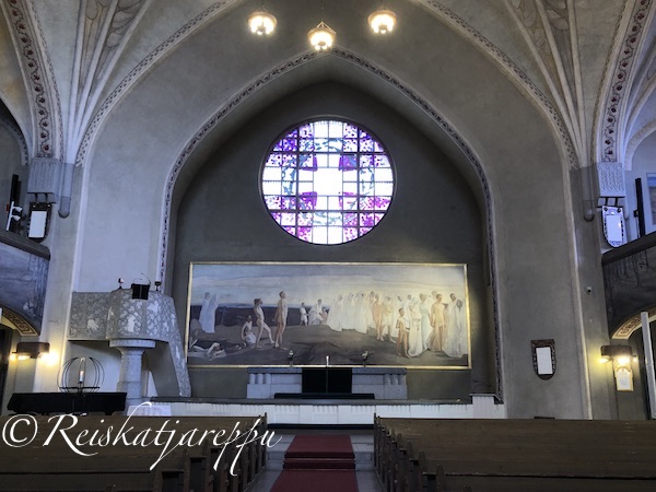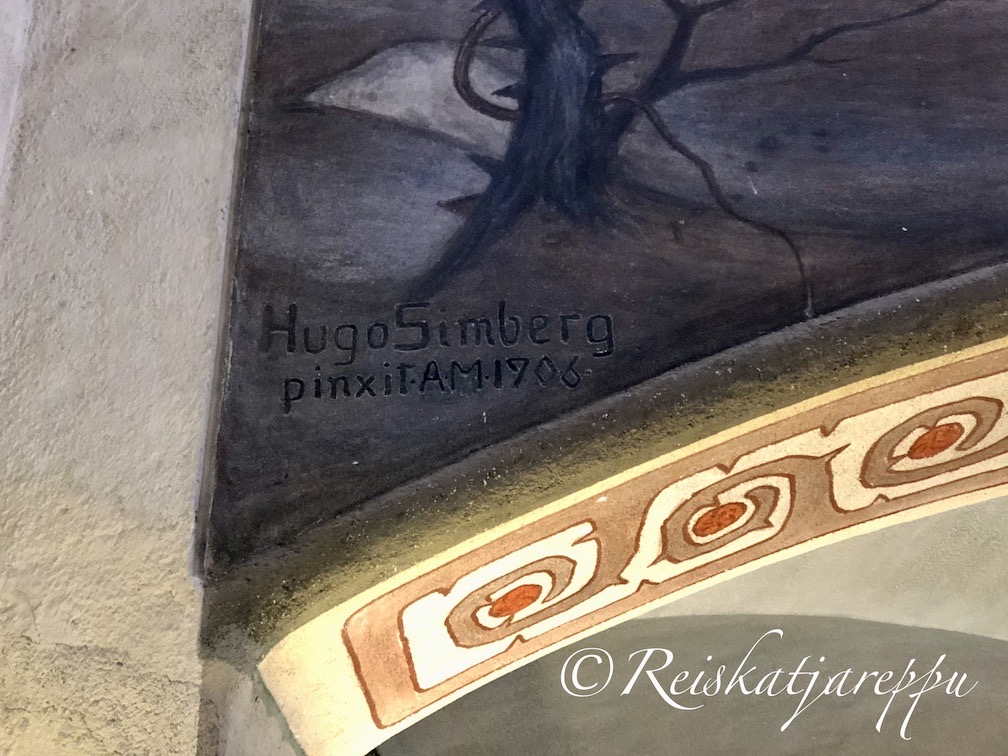 Kirkossa on myös kaksi tunnettua Simbergin maalausta Haavoittunut enkeli ja Kuoleman puutarha. Simberg on toteuttanut näitä kyseisiä maalauksiaan eri tekniikoilla ja erilaisilla toisinnoillaan. Haavoittunut enkeli-fresko sijaitsee etelälehterin päätyseinässä ja tarkka katsoja huomaa taustalla sijaitsevat tehtaanpiiput, joka viestii katsojalle, että Tampereella ollaan.