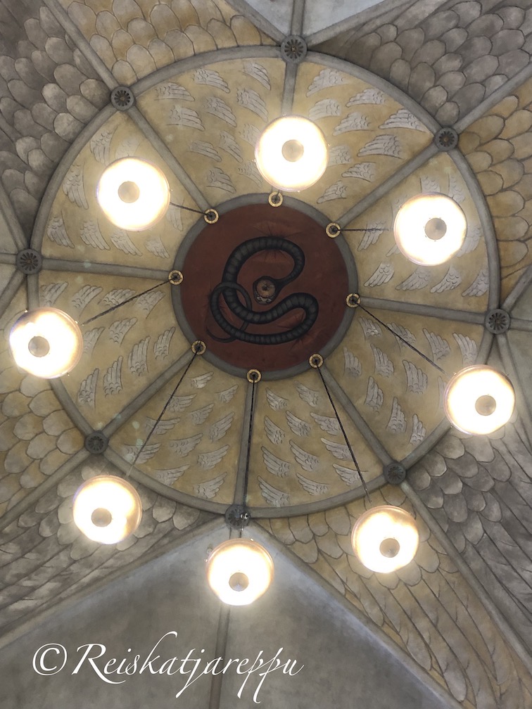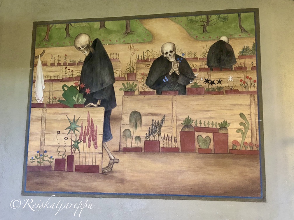 Sisätilojen taidemaalaukset ja niiden aiheet sekä tekniikat saivat taiteilijat Magnus Enckell ja Hugo Simberg itse valita. Maalaukset ovat toteutettu fresko- ja secco-maalauksina. Nämä rohkeat ja yllättävät maalaukset herättivät laajaa keskustelua sen ajan ihmisten keskuudessa. Rohkeita maalauksia ovatkin, kuten alastomat, nuoret köynnöspojat ja käärme kattoholvissa.