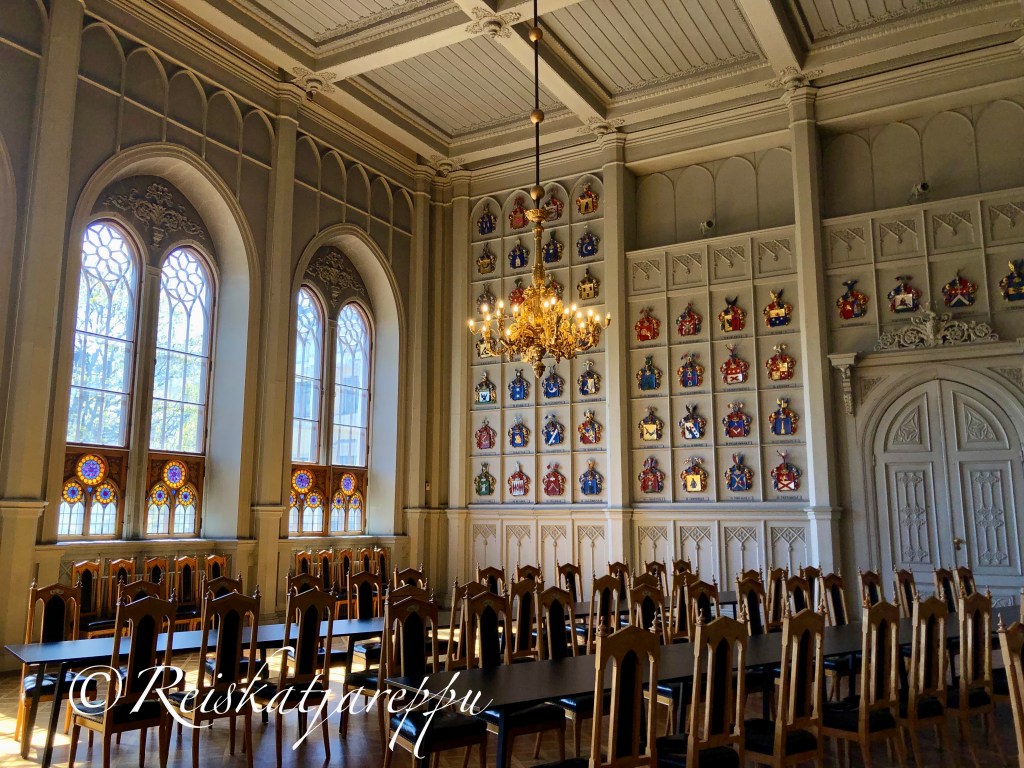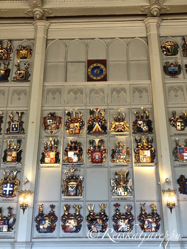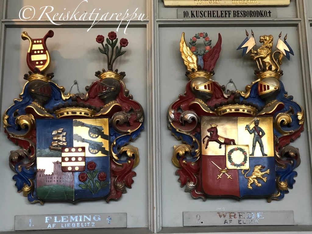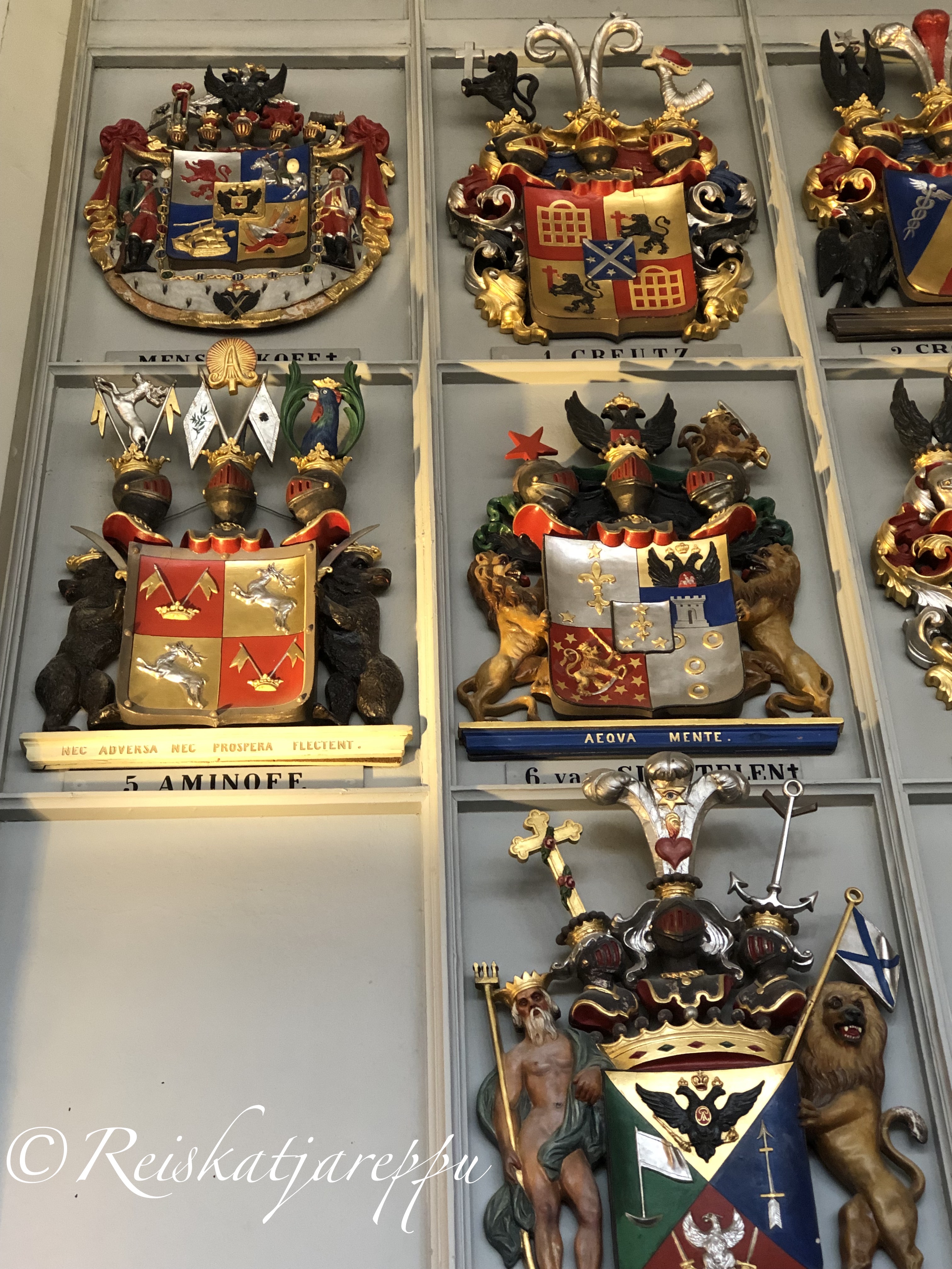 Ritarihuonesalin seiniä koristaa Suomen aatelin vaakunat, jotka ovat sisäänkirjattu Ritarihuoneelle. Kellon alla on kreivillisen sukujen komeat vaakunat, jotka ovat numeroitu 1-11. Vaakunan Nro 6 nimen perässä näkyy risti, joka kertoo sammuneesta suvusta.