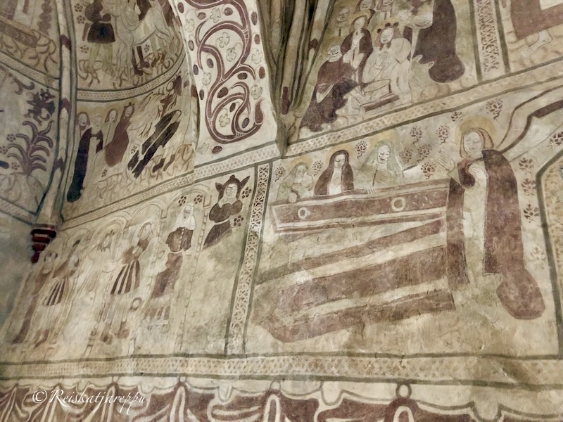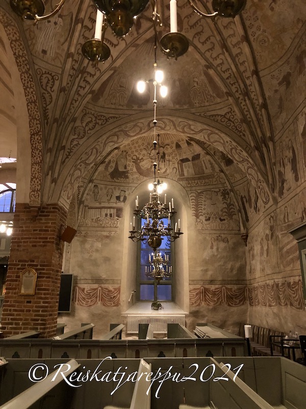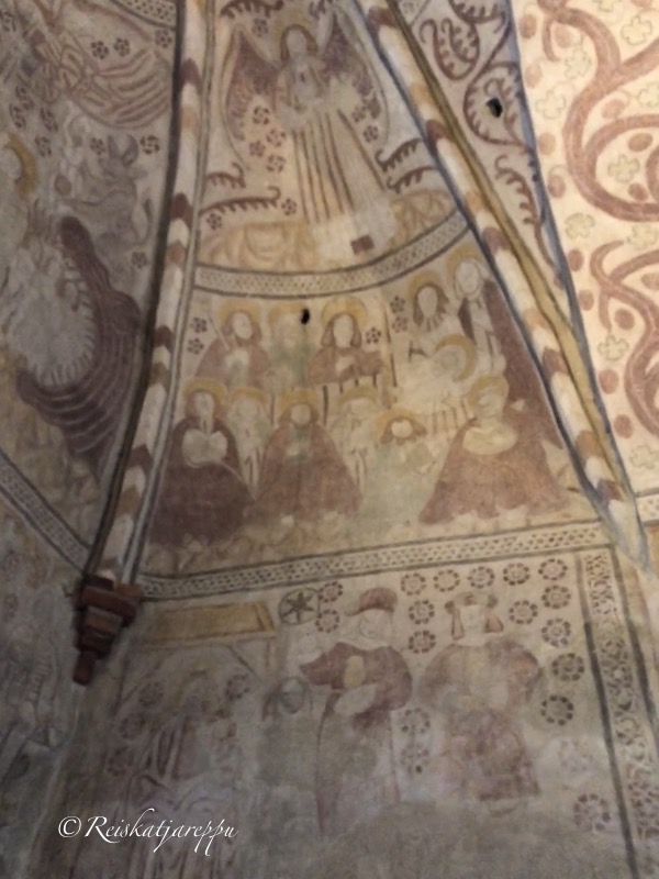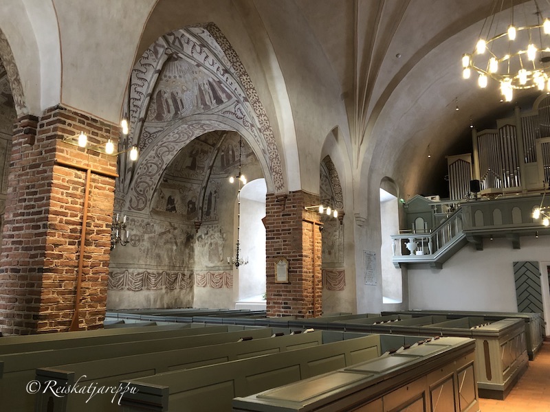 Maalauksista tiedetään, että niitä on tehty kahdessa osassa. Kirkon valmistumisen aikaan 1485-1490 kuuluvat vihkiristit, joita täällä on säilynyt vain yksi. Muut maalaukset ovat 1500-luvun alusta tai 1510-luvulta. Ne kuuluvat samaan ryhmään Inkoon ja Siuntion maalausten sekä Rauman fransiskaanikonventin kirkon maalausten kanssa. (Suomen keskiaikaiset kivikirkot, Markus Hiekkanen)