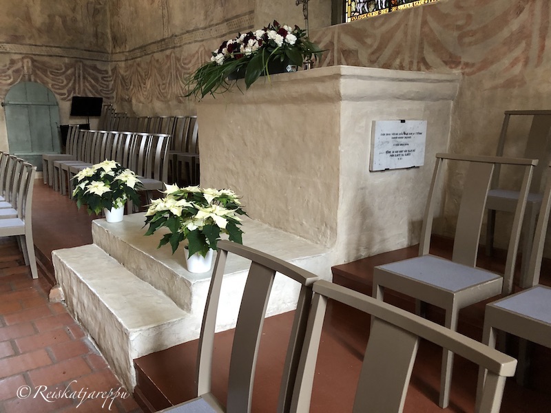 Saarnastuoli on 1690-luvulta. Saarnatuolin vieressä seinällä on teksti MEDAN I HAVEN TRON PÅ LJUSET PÅDET ATT I MÅN BLIVA LJUSETS BARN. Joh. 12:56