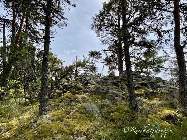 Tästä viisastuneena tällä kertaa tiesimme mistä nousta Viikinkivuorella. Helteet ”olivat” helpottaneet, näin ajattelimme, mutta totuus oli toisenlainen. Lämmintä piisasi, mutta rauhallisesti kävelimme välillä pysähtyen nauttimaan mustikoiden makeasta mausta. Itikat eivätkä paarmat häirinneet kulkuamme.
